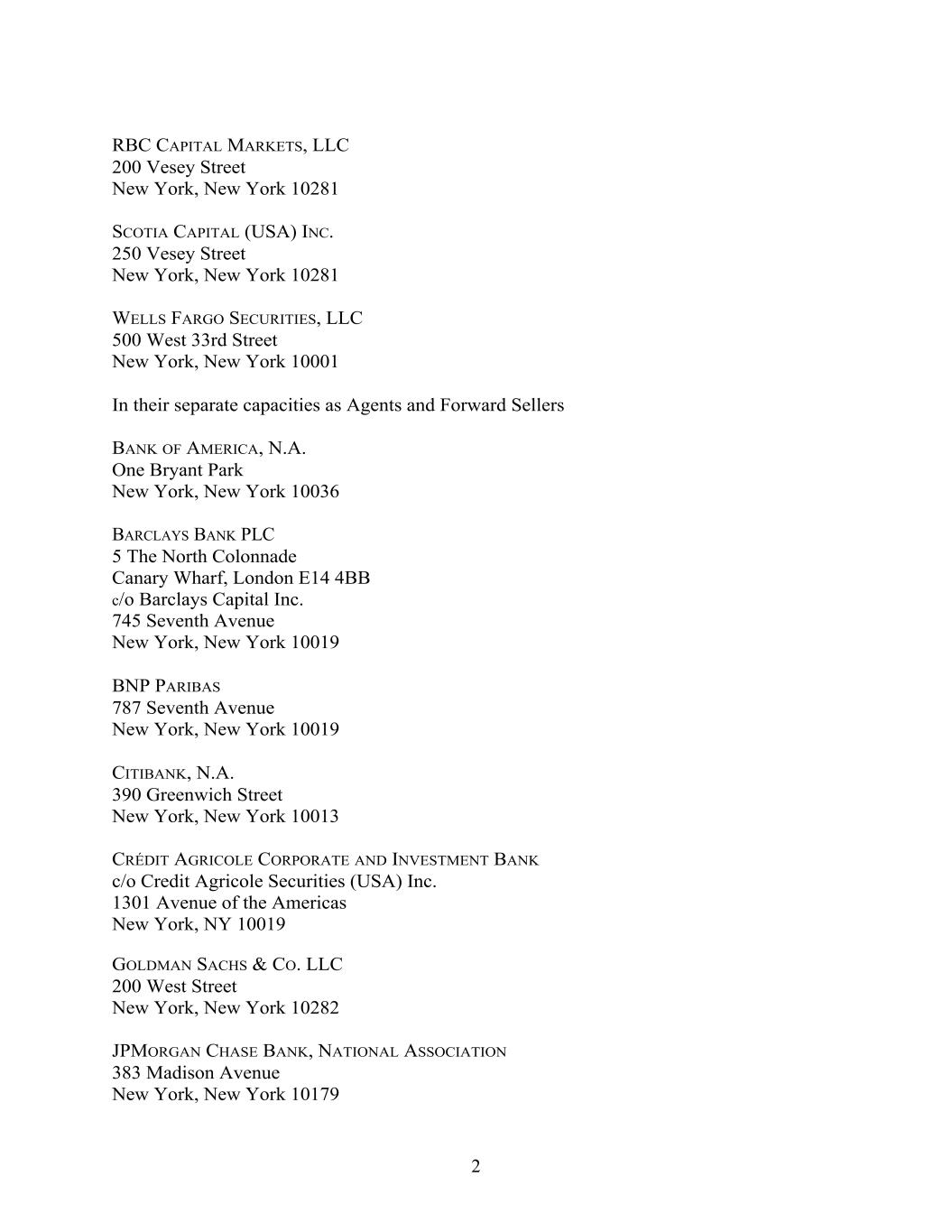 RBC CAPITAL MARKETS, LLC 200 Vesey Street New York, New York 10281 SCOTIA CAPITAL (USA) INC. 250 Vesey Street New York, New York 10281 WELLS FARGO SECURITIES, LLC 500 West 33rd Street New York, New York 10001 In their separate capacities as Agents and Forward Sellers BANK OF AMERICA, N.A. One Bryant Park New York, New York 10036 BARCLAYS BANK PLC 5 The North Colonnade Canary Wharf, London E14 4BB c/o Barclays Capital Inc. 745 Seventh Avenue New York, New York 10019 BNP PARIBAS 787 Seventh Avenue New York, New York 10019 CITIBANK, N.A. 390 Greenwich Street New York, New York 10013 CRÉDIT AGRICOLE CORPORATE AND INVESTMENT BANK c/o Credit Agricole Securities (USA) Inc. 1301 Avenue of the Americas New York, NY 10019 GOLDMAN SACHS & CO. LLC 200 West Street New York, New York 10282 JPMORGAN CHASE BANK, NATIONAL ASSOCIATION 383 Madison Avenue New York, New York 10179 2