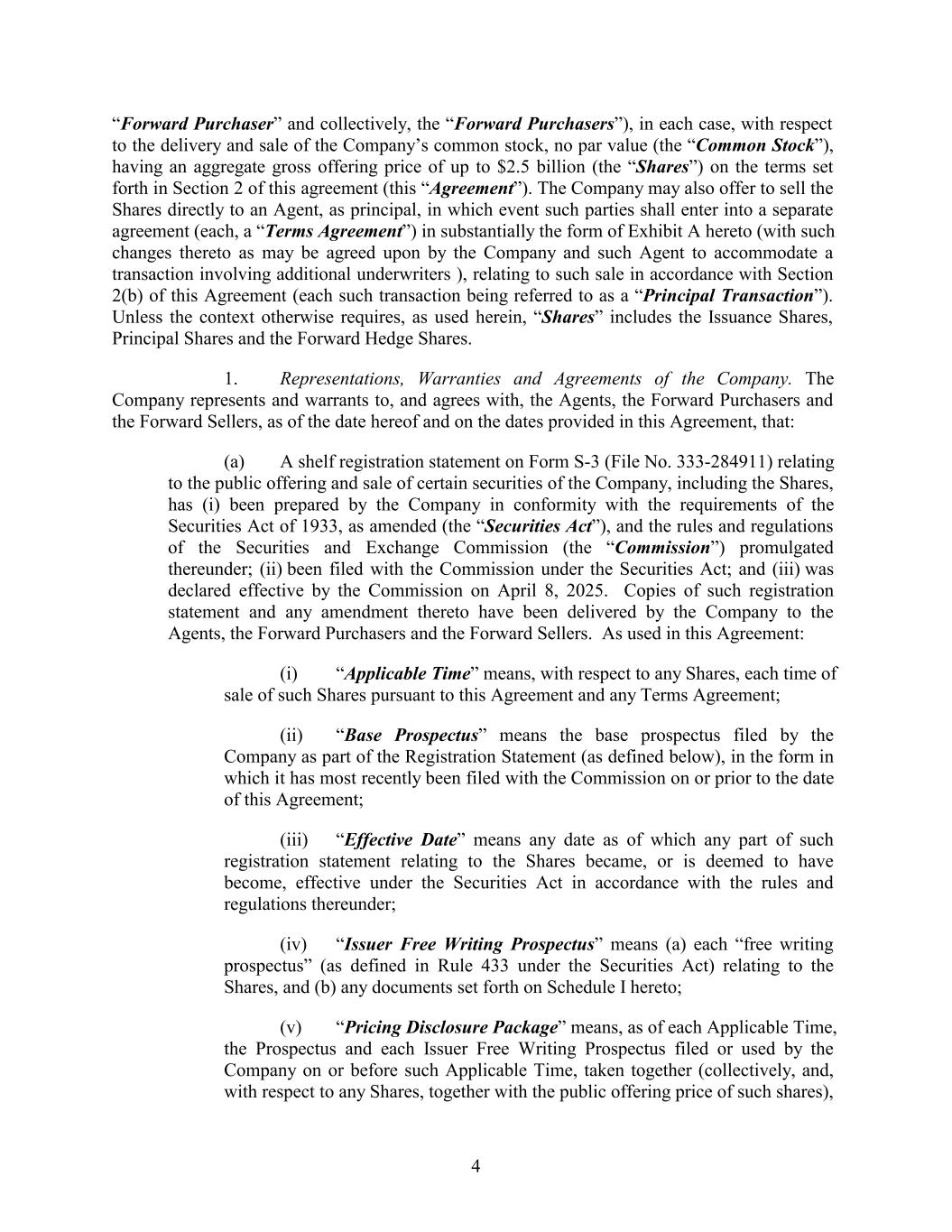 “Forward Purchaser” and collectively, the “Forward Purchasers”), in each case, with respect to the delivery and sale of the Company’s common stock, no par value (the “Common Stock”), having an aggregate gross offering price of up to $2.5 billion (the “Shares”) on the terms set forth in Section 2 of this agreement (this “Agreement”). The Company may also offer to sell the Shares directly to an Agent, as principal, in which event such parties shall enter into a separate agreement (each, a “Terms Agreement”) in substantially the form of Exhibit A hereto (with such changes thereto as may be agreed upon by the Company and such Agent to accommodate a transaction involving additional underwriters ), relating to such sale in accordance with Section 2(b) of this Agreement (each such transaction being referred to as a “Principal Transaction”). Unless the context otherwise requires, as used herein, “Shares” includes the Issuance Shares, Principal Shares and the Forward Hedge Shares. 1. Representations, Warranties and Agreements of the Company. The Company represents and warrants to, and agrees with, the Agents, the Forward Purchasers and the Forward Sellers, as of the date hereof and on the dates provided in this Agreement, that: (a) A shelf registration statement on Form S-3 (File No. 333-284911) relating to the public offering and sale of certain securities of the Company, including the Shares, has (i) been prepared by the Company in conformity with the requirements of the Securities Act of 1933, as amended (the “Securities Act”), and the rules and regulations of the Securities and Exchange Commission (the “Commission”) promulgated thereunder; (ii) been filed with the Commission under the Securities Act; and (iii) was declared effective by the Commission on April 8, 2025. Copies of such registration statement and any amendment thereto have been delivered by the Company to the Agents, the Forward Purchasers and the Forward Sellers. As used in this Agreement: (i) “Applicable Time” means, with respect to any Shares, each time of sale of such Shares pursuant to this Agreement and any Terms Agreement; (ii) “Base Prospectus” means the base prospectus filed by the Company as part of the Registration Statement (as defined below), in the form in which it has most recently been filed with the Commission on or prior to the date of this Agreement; (iii) “Effective Date” means any date as of which any part of such registration statement relating to the Shares became, or is deemed to have become, effective under the Securities Act in accordance with the rules and regulations thereunder; (iv) “Issuer Free Writing Prospectus” means (a) each “free writing prospectus” (as defined in Rule 433 under the Securities Act) relating to the Shares, and (b) any documents set forth on Schedule I hereto; (v) “Pricing Disclosure Package” means, as of each Applicable Time, the Prospectus and each Issuer Free Writing Prospectus filed or used by the Company on or before such Applicable Time, taken together (collectively, and, with respect to any Shares, together with the public offering price of such shares), 4
