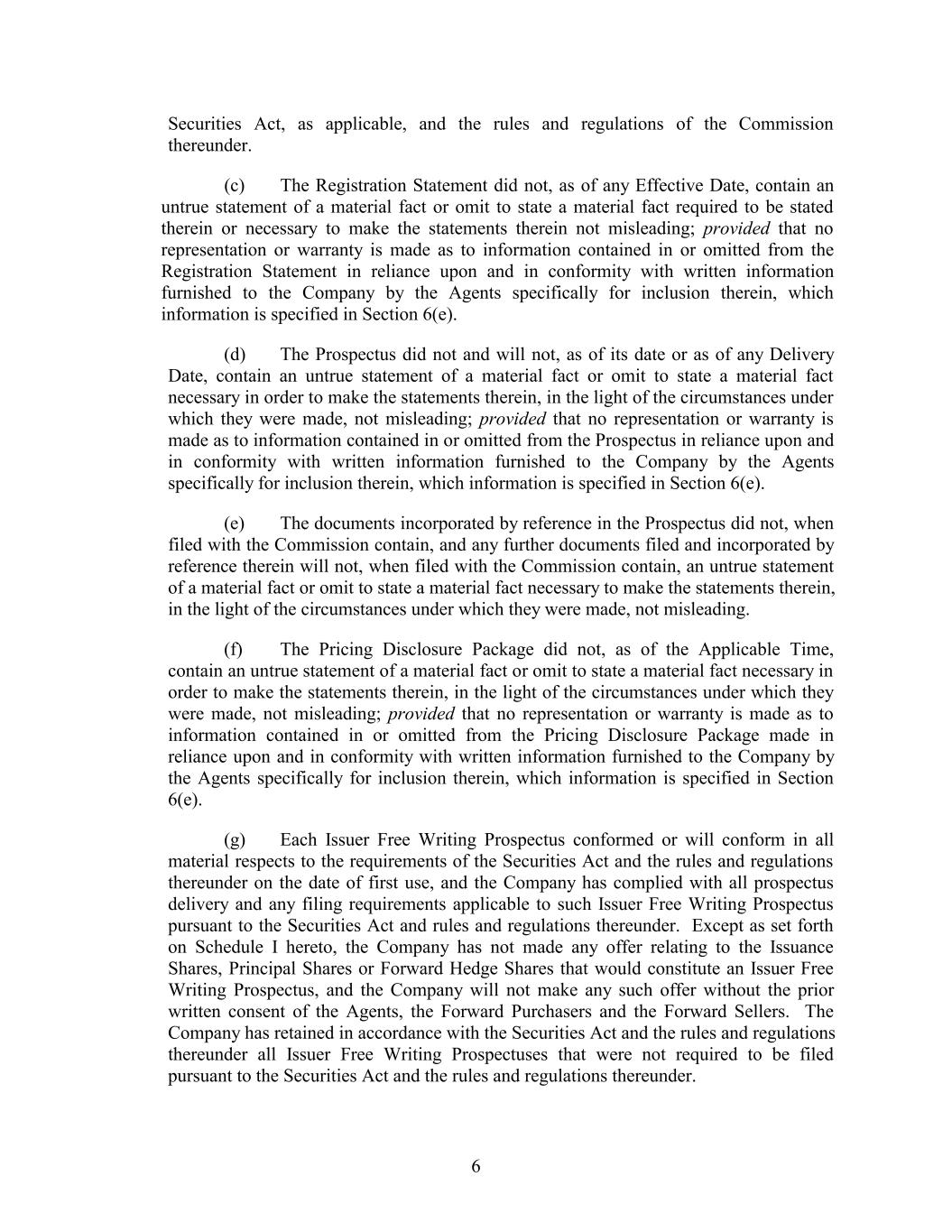 Securities Act, as applicable, and the rules and regulations of the Commission thereunder. (c) The Registration Statement did not, as of any Effective Date, contain an untrue statement of a material fact or omit to state a material fact required to be stated therein or necessary to make the statements therein not misleading; provided that no representation or warranty is made as to information contained in or omitted from the Registration Statement in reliance upon and in conformity with written information furnished to the Company by the Agents specifically for inclusion therein, which information is specified in Section 6(e). (d) The Prospectus did not and will not, as of its date or as of any Delivery Date, contain an untrue statement of a material fact or omit to state a material fact necessary in order to make the statements therein, in the light of the circumstances under which they were made, not misleading; provided that no representation or warranty is made as to information contained in or omitted from the Prospectus in reliance upon and in conformity with written information furnished to the Company by the Agents specifically for inclusion therein, which information is specified in Section 6(e). (e) The documents incorporated by reference in the Prospectus did not, when filed with the Commission contain, and any further documents filed and incorporated by reference therein will not, when filed with the Commission contain, an untrue statement of a material fact or omit to state a material fact necessary to make the statements therein, in the light of the circumstances under which they were made, not misleading. (f) The Pricing Disclosure Package did not, as of the Applicable Time, contain an untrue statement of a material fact or omit to state a material fact necessary in order to make the statements therein, in the light of the circumstances under which they were made, not misleading; provided that no representation or warranty is made as to information contained in or omitted from the Pricing Disclosure Package made in reliance upon and in conformity with written information furnished to the Company by the Agents specifically for inclusion therein, which information is specified in Section 6(e). (g) Each Issuer Free Writing Prospectus conformed or will conform in all material respects to the requirements of the Securities Act and the rules and regulations thereunder on the date of first use, and the Company has complied with all prospectus delivery and any filing requirements applicable to such Issuer Free Writing Prospectus pursuant to the Securities Act and rules and regulations thereunder. Except as set forth on Schedule I hereto, the Company has not made any offer relating to the Issuance Shares, Principal Shares or Forward Hedge Shares that would constitute an Issuer Free Writing Prospectus, and the Company will not make any such offer without the prior written consent of the Agents, the Forward Purchasers and the Forward Sellers. The Company has retained in accordance with the Securities Act and the rules and regulations thereunder all Issuer Free Writing Prospectuses that were not required to be filed pursuant to the Securities Act and the rules and regulations thereunder. 6