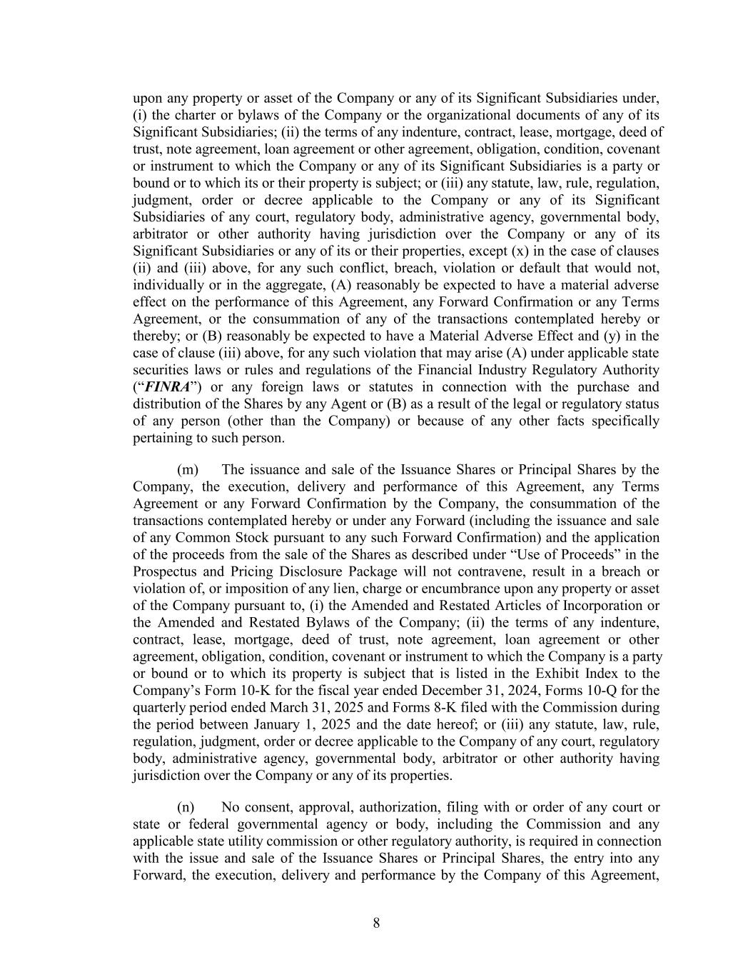 upon any property or asset of the Company or any of its Significant Subsidiaries under, (i) the charter or bylaws of the Company or the organizational documents of any of its Significant Subsidiaries; (ii) the terms of any indenture, contract, lease, mortgage, deed of trust, note agreement, loan agreement or other agreement, obligation, condition, covenant or instrument to which the Company or any of its Significant Subsidiaries is a party or bound or to which its or their property is subject; or (iii) any statute, law, rule, regulation, judgment, order or decree applicable to the Company or any of its Significant Subsidiaries of any court, regulatory body, administrative agency, governmental body, arbitrator or other authority having jurisdiction over the Company or any of its Significant Subsidiaries or any of its or their properties, except (x) in the case of clauses (ii) and (iii) above, for any such conflict, breach, violation or default that would not, individually or in the aggregate, (A) reasonably be expected to have a material adverse effect on the performance of this Agreement, any Forward Confirmation or any Terms Agreement, or the consummation of any of the transactions contemplated hereby or thereby; or (B) reasonably be expected to have a Material Adverse Effect and (y) in the case of clause (iii) above, for any such violation that may arise (A) under applicable state securities laws or rules and regulations of the Financial Industry Regulatory Authority (“FINRA”) or any foreign laws or statutes in connection with the purchase and distribution of the Shares by any Agent or (B) as a result of the legal or regulatory status of any person (other than the Company) or because of any other facts specifically pertaining to such person. (m) The issuance and sale of the Issuance Shares or Principal Shares by the Company, the execution, delivery and performance of this Agreement, any Terms Agreement or any Forward Confirmation by the Company, the consummation of the transactions contemplated hereby or under any Forward (including the issuance and sale of any Common Stock pursuant to any such Forward Confirmation) and the application of the proceeds from the sale of the Shares as described under “Use of Proceeds” in the Prospectus and Pricing Disclosure Package will not contravene, result in a breach or violation of, or imposition of any lien, charge or encumbrance upon any property or asset of the Company pursuant to, (i) the Amended and Restated Articles of Incorporation or the Amended and Restated Bylaws of the Company; (ii) the terms of any indenture, contract, lease, mortgage, deed of trust, note agreement, loan agreement or other agreement, obligation, condition, covenant or instrument to which the Company is a party or bound or to which its property is subject that is listed in the Exhibit Index to the Company’s Form 10-K for the fiscal year ended December 31, 2024, Forms 10-Q for the quarterly period ended March 31, 2025 and Forms 8-K filed with the Commission during the period between January 1, 2025 and the date hereof; or (iii) any statute, law, rule, regulation, judgment, order or decree applicable to the Company of any court, regulatory body, administrative agency, governmental body, arbitrator or other authority having jurisdiction over the Company or any of its properties. (n) No consent, approval, authorization, filing with or order of any court or state or federal governmental agency or body, including the Commission and any applicable state utility commission or other regulatory authority, is required in connection with the issue and sale of the Issuance Shares or Principal Shares, the entry into any Forward, the execution, delivery and performance by the Company of this Agreement, 8
