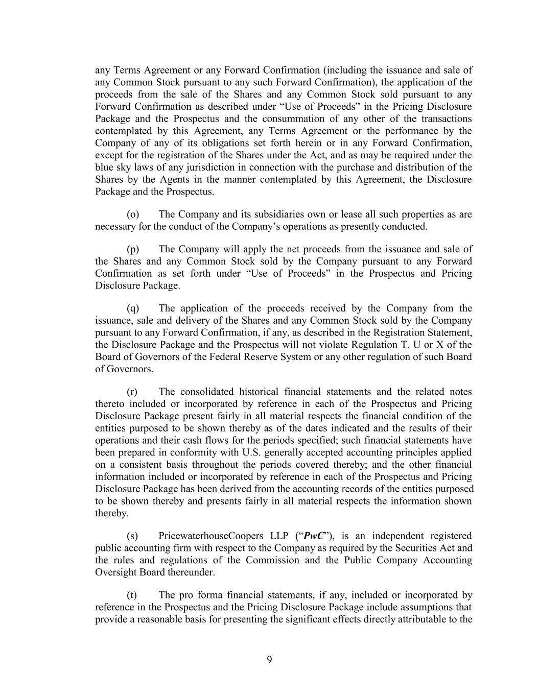 any Terms Agreement or any Forward Confirmation (including the issuance and sale of any Common Stock pursuant to any such Forward Confirmation), the application of the proceeds from the sale of the Shares and any Common Stock sold pursuant to any Forward Confirmation as described under “Use of Proceeds” in the Pricing Disclosure Package and the Prospectus and the consummation of any other of the transactions contemplated by this Agreement, any Terms Agreement or the performance by the Company of any of its obligations set forth herein or in any Forward Confirmation, except for the registration of the Shares under the Act, and as may be required under the blue sky laws of any jurisdiction in connection with the purchase and distribution of the Shares by the Agents in the manner contemplated by this Agreement, the Disclosure Package and the Prospectus. (o) The Company and its subsidiaries own or lease all such properties as are necessary for the conduct of the Company’s operations as presently conducted. (p) The Company will apply the net proceeds from the issuance and sale of the Shares and any Common Stock sold by the Company pursuant to any Forward Confirmation as set forth under “Use of Proceeds” in the Prospectus and Pricing Disclosure Package. (q) The application of the proceeds received by the Company from the issuance, sale and delivery of the Shares and any Common Stock sold by the Company pursuant to any Forward Confirmation, if any, as described in the Registration Statement, the Disclosure Package and the Prospectus will not violate Regulation T, U or X of the Board of Governors of the Federal Reserve System or any other regulation of such Board of Governors. (r) The consolidated historical financial statements and the related notes thereto included or incorporated by reference in each of the Prospectus and Pricing Disclosure Package present fairly in all material respects the financial condition of the entities purposed to be shown thereby as of the dates indicated and the results of their operations and their cash flows for the periods specified; such financial statements have been prepared in conformity with U.S. generally accepted accounting principles applied on a consistent basis throughout the periods covered thereby; and the other financial information included or incorporated by reference in each of the Prospectus and Pricing Disclosure Package has been derived from the accounting records of the entities purposed to be shown thereby and presents fairly in all material respects the information shown thereby. (s) PricewaterhouseCoopers LLP (“PwC”), is an independent registered public accounting firm with respect to the Company as required by the Securities Act and the rules and regulations of the Commission and the Public Company Accounting Oversight Board thereunder. (t) The pro forma financial statements, if any, included or incorporated by reference in the Prospectus and the Pricing Disclosure Package include assumptions that provide a reasonable basis for presenting the significant effects directly attributable to the 9