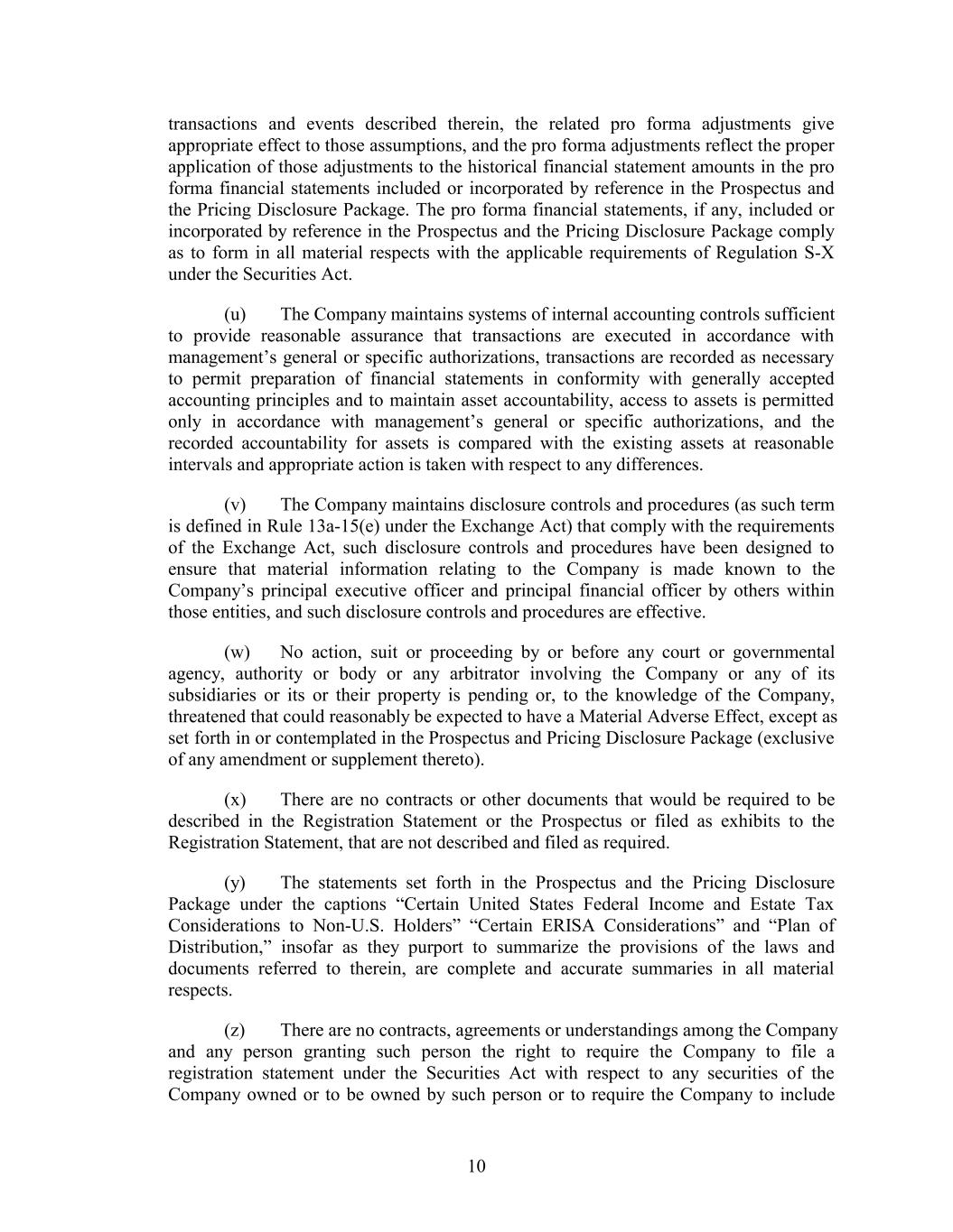 transactions and events described therein, the related pro forma adjustments give appropriate effect to those assumptions, and the pro forma adjustments reflect the proper application of those adjustments to the historical financial statement amounts in the pro forma financial statements included or incorporated by reference in the Prospectus and the Pricing Disclosure Package. The pro forma financial statements, if any, included or incorporated by reference in the Prospectus and the Pricing Disclosure Package comply as to form in all material respects with the applicable requirements of Regulation S-X under the Securities Act. (u) The Company maintains systems of internal accounting controls sufficient to provide reasonable assurance that transactions are executed in accordance with management’s general or specific authorizations, transactions are recorded as necessary to permit preparation of financial statements in conformity with generally accepted accounting principles and to maintain asset accountability, access to assets is permitted only in accordance with management’s general or specific authorizations, and the recorded accountability for assets is compared with the existing assets at reasonable intervals and appropriate action is taken with respect to any differences. (v) The Company maintains disclosure controls and procedures (as such term is defined in Rule 13a-15(e) under the Exchange Act) that comply with the requirements of the Exchange Act, such disclosure controls and procedures have been designed to ensure that material information relating to the Company is made known to the Company’s principal executive officer and principal financial officer by others within those entities, and such disclosure controls and procedures are effective. (w) No action, suit or proceeding by or before any court or governmental agency, authority or body or any arbitrator involving the Company or any of its subsidiaries or its or their property is pending or, to the knowledge of the Company, threatened that could reasonably be expected to have a Material Adverse Effect, except as set forth in or contemplated in the Prospectus and Pricing Disclosure Package (exclusive of any amendment or supplement thereto). (x) There are no contracts or other documents that would be required to be described in the Registration Statement or the Prospectus or filed as exhibits to the Registration Statement, that are not described and filed as required. (y) The statements set forth in the Prospectus and the Pricing Disclosure Package under the captions “Certain United States Federal Income and Estate Tax Considerations to Non-U.S. Holders” “Certain ERISA Considerations” and “Plan of Distribution,” insofar as they purport to summarize the provisions of the laws and documents referred to therein, are complete and accurate summaries in all material respects. (z) There are no contracts, agreements or understandings among the Company and any person granting such person the right to require the Company to file a registration statement under the Securities Act with respect to any securities of the Company owned or to be owned by such person or to require the Company to include 10