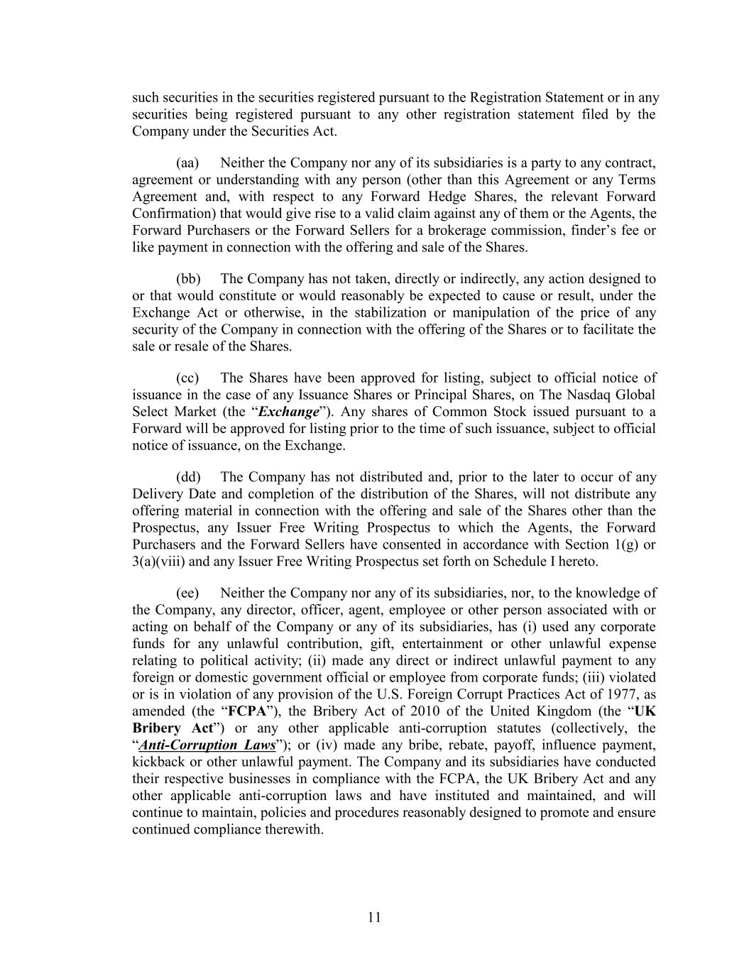 such securities in the securities registered pursuant to the Registration Statement or in any securities being registered pursuant to any other registration statement filed by the Company under the Securities Act. (aa) Neither the Company nor any of its subsidiaries is a party to any contract, agreement or understanding with any person (other than this Agreement or any Terms Agreement and, with respect to any Forward Hedge Shares, the relevant Forward Confirmation) that would give rise to a valid claim against any of them or the Agents, the Forward Purchasers or the Forward Sellers for a brokerage commission, finder’s fee or like payment in connection with the offering and sale of the Shares. (bb) The Company has not taken, directly or indirectly, any action designed to or that would constitute or would reasonably be expected to cause or result, under the Exchange Act or otherwise, in the stabilization or manipulation of the price of any security of the Company in connection with the offering of the Shares or to facilitate the sale or resale of the Shares. (cc) The Shares have been approved for listing, subject to official notice of issuance in the case of any Issuance Shares or Principal Shares, on The Nasdaq Global Select Market (the “Exchange”). Any shares of Common Stock issued pursuant to a Forward will be approved for listing prior to the time of such issuance, subject to official notice of issuance, on the Exchange. (dd) The Company has not distributed and, prior to the later to occur of any Delivery Date and completion of the distribution of the Shares, will not distribute any offering material in connection with the offering and sale of the Shares other than the Prospectus, any Issuer Free Writing Prospectus to which the Agents, the Forward Purchasers and the Forward Sellers have consented in accordance with Section 1(g) or 3(a)(viii) and any Issuer Free Writing Prospectus set forth on Schedule I hereto. (ee) Neither the Company nor any of its subsidiaries, nor, to the knowledge of the Company, any director, officer, agent, employee or other person associated with or acting on behalf of the Company or any of its subsidiaries, has (i) used any corporate funds for any unlawful contribution, gift, entertainment or other unlawful expense relating to political activity; (ii) made any direct or indirect unlawful payment to any foreign or domestic government official or employee from corporate funds; (iii) violated or is in violation of any provision of the U.S. Foreign Corrupt Practices Act of 1977, as amended (the “FCPA”), the Bribery Act of 2010 of the United Kingdom (the “UK Bribery Act”) or any other applicable anti-corruption statutes (collectively, the “Anti-Corruption Laws”); or (iv) made any bribe, rebate, payoff, influence payment, kickback or other unlawful payment. The Company and its subsidiaries have conducted their respective businesses in compliance with the FCPA, the UK Bribery Act and any other applicable anti-corruption laws and have instituted and maintained, and will continue to maintain, policies and procedures reasonably designed to promote and ensure continued compliance therewith. 11