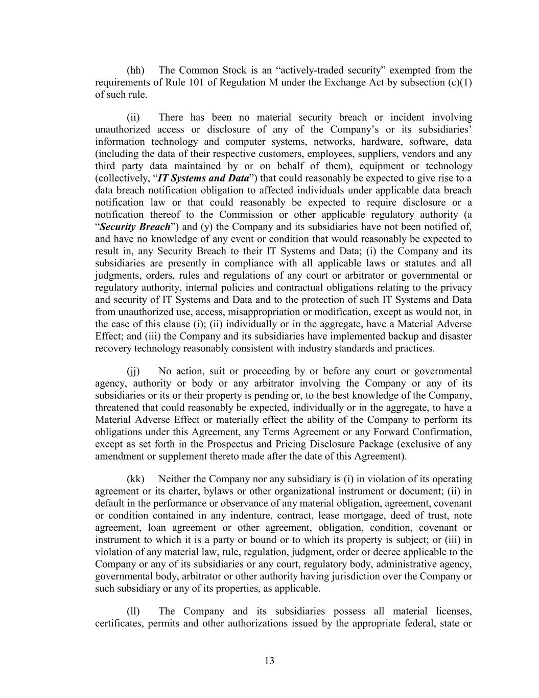 (hh) The Common Stock is an “actively-traded security” exempted from the requirements of Rule 101 of Regulation M under the Exchange Act by subsection (c)(1) of such rule. (ii) There has been no material security breach or incident involving unauthorized access or disclosure of any of the Company’s or its subsidiaries’ information technology and computer systems, networks, hardware, software, data (including the data of their respective customers, employees, suppliers, vendors and any third party data maintained by or on behalf of them), equipment or technology (collectively, “IT Systems and Data”) that could reasonably be expected to give rise to a data breach notification obligation to affected individuals under applicable data breach notification law or that could reasonably be expected to require disclosure or a notification thereof to the Commission or other applicable regulatory authority (a “Security Breach”) and (y) the Company and its subsidiaries have not been notified of, and have no knowledge of any event or condition that would reasonably be expected to result in, any Security Breach to their IT Systems and Data; (i) the Company and its subsidiaries are presently in compliance with all applicable laws or statutes and all judgments, orders, rules and regulations of any court or arbitrator or governmental or regulatory authority, internal policies and contractual obligations relating to the privacy and security of IT Systems and Data and to the protection of such IT Systems and Data from unauthorized use, access, misappropriation or modification, except as would not, in the case of this clause (i); (ii) individually or in the aggregate, have a Material Adverse Effect; and (iii) the Company and its subsidiaries have implemented backup and disaster recovery technology reasonably consistent with industry standards and practices. (jj) No action, suit or proceeding by or before any court or governmental agency, authority or body or any arbitrator involving the Company or any of its subsidiaries or its or their property is pending or, to the best knowledge of the Company, threatened that could reasonably be expected, individually or in the aggregate, to have a Material Adverse Effect or materially effect the ability of the Company to perform its obligations under this Agreement, any Terms Agreement or any Forward Confirmation, except as set forth in the Prospectus and Pricing Disclosure Package (exclusive of any amendment or supplement thereto made after the date of this Agreement). (kk) Neither the Company nor any subsidiary is (i) in violation of its operating agreement or its charter, bylaws or other organizational instrument or document; (ii) in default in the performance or observance of any material obligation, agreement, covenant or condition contained in any indenture, contract, lease mortgage, deed of trust, note agreement, loan agreement or other agreement, obligation, condition, covenant or instrument to which it is a party or bound or to which its property is subject; or (iii) in violation of any material law, rule, regulation, judgment, order or decree applicable to the Company or any of its subsidiaries or any court, regulatory body, administrative agency, governmental body, arbitrator or other authority having jurisdiction over the Company or such subsidiary or any of its properties, as applicable. (ll) The Company and its subsidiaries possess all material licenses, certificates, permits and other authorizations issued by the appropriate federal, state or 13