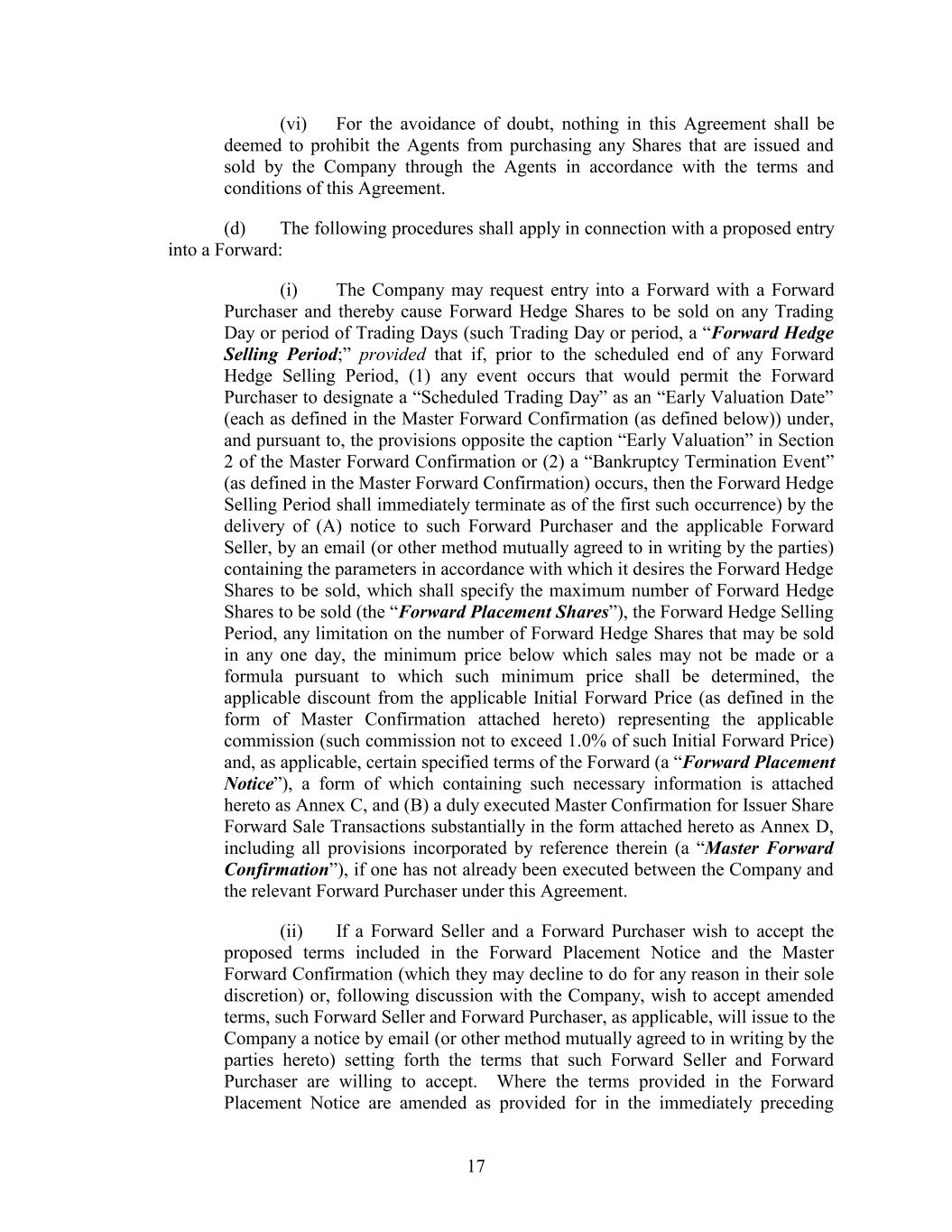 (vi) For the avoidance of doubt, nothing in this Agreement shall be deemed to prohibit the Agents from purchasing any Shares that are issued and sold by the Company through the Agents in accordance with the terms and conditions of this Agreement. (d) The following procedures shall apply in connection with a proposed entry into a Forward: (i) The Company may request entry into a Forward with a Forward Purchaser and thereby cause Forward Hedge Shares to be sold on any Trading Day or period of Trading Days (such Trading Day or period, a “Forward Hedge Selling Period;” provided that if, prior to the scheduled end of any Forward Hedge Selling Period, (1) any event occurs that would permit the Forward Purchaser to designate a “Scheduled Trading Day” as an “Early Valuation Date” (each as defined in the Master Forward Confirmation (as defined below)) under, and pursuant to, the provisions opposite the caption “Early Valuation” in Section 2 of the Master Forward Confirmation or (2) a “Bankruptcy Termination Event” (as defined in the Master Forward Confirmation) occurs, then the Forward Hedge Selling Period shall immediately terminate as of the first such occurrence) by the delivery of (A) notice to such Forward Purchaser and the applicable Forward Seller, by an email (or other method mutually agreed to in writing by the parties) containing the parameters in accordance with which it desires the Forward Hedge Shares to be sold, which shall specify the maximum number of Forward Hedge Shares to be sold (the “Forward Placement Shares”), the Forward Hedge Selling Period, any limitation on the number of Forward Hedge Shares that may be sold in any one day, the minimum price below which sales may not be made or a formula pursuant to which such minimum price shall be determined, the applicable discount from the applicable Initial Forward Price (as defined in the form of Master Confirmation attached hereto) representing the applicable commission (such commission not to exceed 1.0% of such Initial Forward Price) and, as applicable, certain specified terms of the Forward (a “Forward Placement Notice”), a form of which containing such necessary information is attached hereto as Annex C, and (B) a duly executed Master Confirmation for Issuer Share Forward Sale Transactions substantially in the form attached hereto as Annex D, including all provisions incorporated by reference therein (a “Master Forward Confirmation”), if one has not already been executed between the Company and the relevant Forward Purchaser under this Agreement. (ii) If a Forward Seller and a Forward Purchaser wish to accept the proposed terms included in the Forward Placement Notice and the Master Forward Confirmation (which they may decline to do for any reason in their sole discretion) or, following discussion with the Company, wish to accept amended terms, such Forward Seller and Forward Purchaser, as applicable, will issue to the Company a notice by email (or other method mutually agreed to in writing by the parties hereto) setting forth the terms that such Forward Seller and Forward Purchaser are willing to accept. Where the terms provided in the Forward Placement Notice are amended as provided for in the immediately preceding 17
