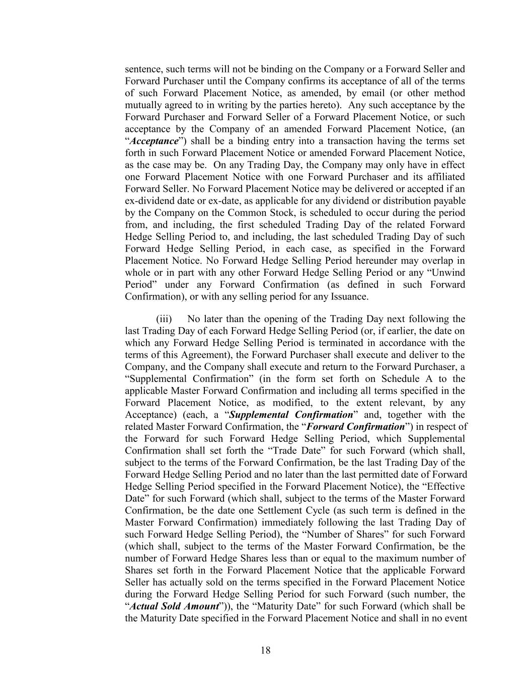 sentence, such terms will not be binding on the Company or a Forward Seller and Forward Purchaser until the Company confirms its acceptance of all of the terms of such Forward Placement Notice, as amended, by email (or other method mutually agreed to in writing by the parties hereto). Any such acceptance by the Forward Purchaser and Forward Seller of a Forward Placement Notice, or such acceptance by the Company of an amended Forward Placement Notice, (an “Acceptance”) shall be a binding entry into a transaction having the terms set forth in such Forward Placement Notice or amended Forward Placement Notice, as the case may be. On any Trading Day, the Company may only have in effect one Forward Placement Notice with one Forward Purchaser and its affiliated Forward Seller. No Forward Placement Notice may be delivered or accepted if an ex-dividend date or ex-date, as applicable for any dividend or distribution payable by the Company on the Common Stock, is scheduled to occur during the period from, and including, the first scheduled Trading Day of the related Forward Hedge Selling Period to, and including, the last scheduled Trading Day of such Forward Hedge Selling Period, in each case, as specified in the Forward Placement Notice. No Forward Hedge Selling Period hereunder may overlap in whole or in part with any other Forward Hedge Selling Period or any “Unwind Period” under any Forward Confirmation (as defined in such Forward Confirmation), or with any selling period for any Issuance. (iii) No later than the opening of the Trading Day next following the last Trading Day of each Forward Hedge Selling Period (or, if earlier, the date on which any Forward Hedge Selling Period is terminated in accordance with the terms of this Agreement), the Forward Purchaser shall execute and deliver to the Company, and the Company shall execute and return to the Forward Purchaser, a “Supplemental Confirmation” (in the form set forth on Schedule A to the applicable Master Forward Confirmation and including all terms specified in the Forward Placement Notice, as modified, to the extent relevant, by any Acceptance) (each, a “Supplemental Confirmation” and, together with the related Master Forward Confirmation, the “Forward Confirmation”) in respect of the Forward for such Forward Hedge Selling Period, which Supplemental Confirmation shall set forth the “Trade Date” for such Forward (which shall, subject to the terms of the Forward Confirmation, be the last Trading Day of the Forward Hedge Selling Period and no later than the last permitted date of Forward Hedge Selling Period specified in the Forward Placement Notice), the “Effective Date” for such Forward (which shall, subject to the terms of the Master Forward Confirmation, be the date one Settlement Cycle (as such term is defined in the Master Forward Confirmation) immediately following the last Trading Day of such Forward Hedge Selling Period), the “Number of Shares” for such Forward (which shall, subject to the terms of the Master Forward Confirmation, be the number of Forward Hedge Shares less than or equal to the maximum number of Shares set forth in the Forward Placement Notice that the applicable Forward Seller has actually sold on the terms specified in the Forward Placement Notice during the Forward Hedge Selling Period for such Forward (such number, the “Actual Sold Amount”)), the “Maturity Date” for such Forward (which shall be the Maturity Date specified in the Forward Placement Notice and shall in no event 18