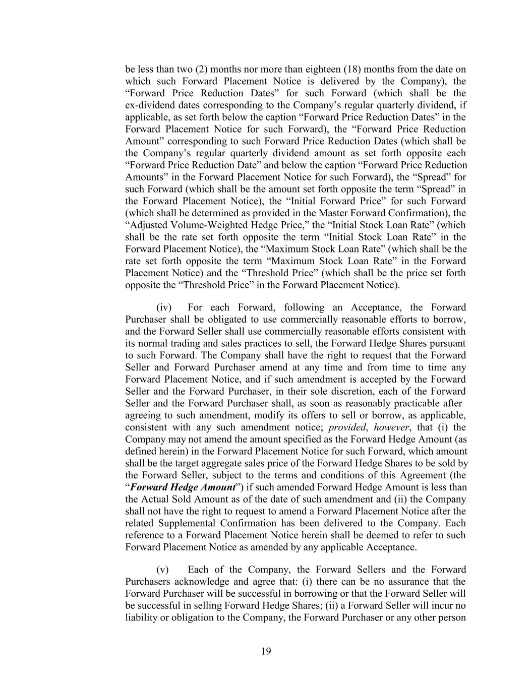 be less than two (2) months nor more than eighteen (18) months from the date on which such Forward Placement Notice is delivered by the Company), the “Forward Price Reduction Dates” for such Forward (which shall be the ex-dividend dates corresponding to the Company’s regular quarterly dividend, if applicable, as set forth below the caption “Forward Price Reduction Dates” in the Forward Placement Notice for such Forward), the “Forward Price Reduction Amount” corresponding to such Forward Price Reduction Dates (which shall be the Company’s regular quarterly dividend amount as set forth opposite each “Forward Price Reduction Date” and below the caption “Forward Price Reduction Amounts” in the Forward Placement Notice for such Forward), the “Spread” for such Forward (which shall be the amount set forth opposite the term “Spread” in the Forward Placement Notice), the “Initial Forward Price” for such Forward (which shall be determined as provided in the Master Forward Confirmation), the “Adjusted Volume-Weighted Hedge Price,” the “Initial Stock Loan Rate” (which shall be the rate set forth opposite the term “Initial Stock Loan Rate” in the Forward Placement Notice), the “Maximum Stock Loan Rate” (which shall be the rate set forth opposite the term “Maximum Stock Loan Rate” in the Forward Placement Notice) and the “Threshold Price” (which shall be the price set forth opposite the “Threshold Price” in the Forward Placement Notice). (iv) For each Forward, following an Acceptance, the Forward Purchaser shall be obligated to use commercially reasonable efforts to borrow, and the Forward Seller shall use commercially reasonable efforts consistent with its normal trading and sales practices to sell, the Forward Hedge Shares pursuant to such Forward. The Company shall have the right to request that the Forward Seller and Forward Purchaser amend at any time and from time to time any Forward Placement Notice, and if such amendment is accepted by the Forward Seller and the Forward Purchaser, in their sole discretion, each of the Forward Seller and the Forward Purchaser shall, as soon as reasonably practicable after agreeing to such amendment, modify its offers to sell or borrow, as applicable, consistent with any such amendment notice; provided, however, that (i) the Company may not amend the amount specified as the Forward Hedge Amount (as defined herein) in the Forward Placement Notice for such Forward, which amount shall be the target aggregate sales price of the Forward Hedge Shares to be sold by the Forward Seller, subject to the terms and conditions of this Agreement (the “Forward Hedge Amount”) if such amended Forward Hedge Amount is less than the Actual Sold Amount as of the date of such amendment and (ii) the Company shall not have the right to request to amend a Forward Placement Notice after the related Supplemental Confirmation has been delivered to the Company. Each reference to a Forward Placement Notice herein shall be deemed to refer to such Forward Placement Notice as amended by any applicable Acceptance. (v) Each of the Company, the Forward Sellers and the Forward Purchasers acknowledge and agree that: (i) there can be no assurance that the Forward Purchaser will be successful in borrowing or that the Forward Seller will be successful in selling Forward Hedge Shares; (ii) a Forward Seller will incur no liability or obligation to the Company, the Forward Purchaser or any other person 19