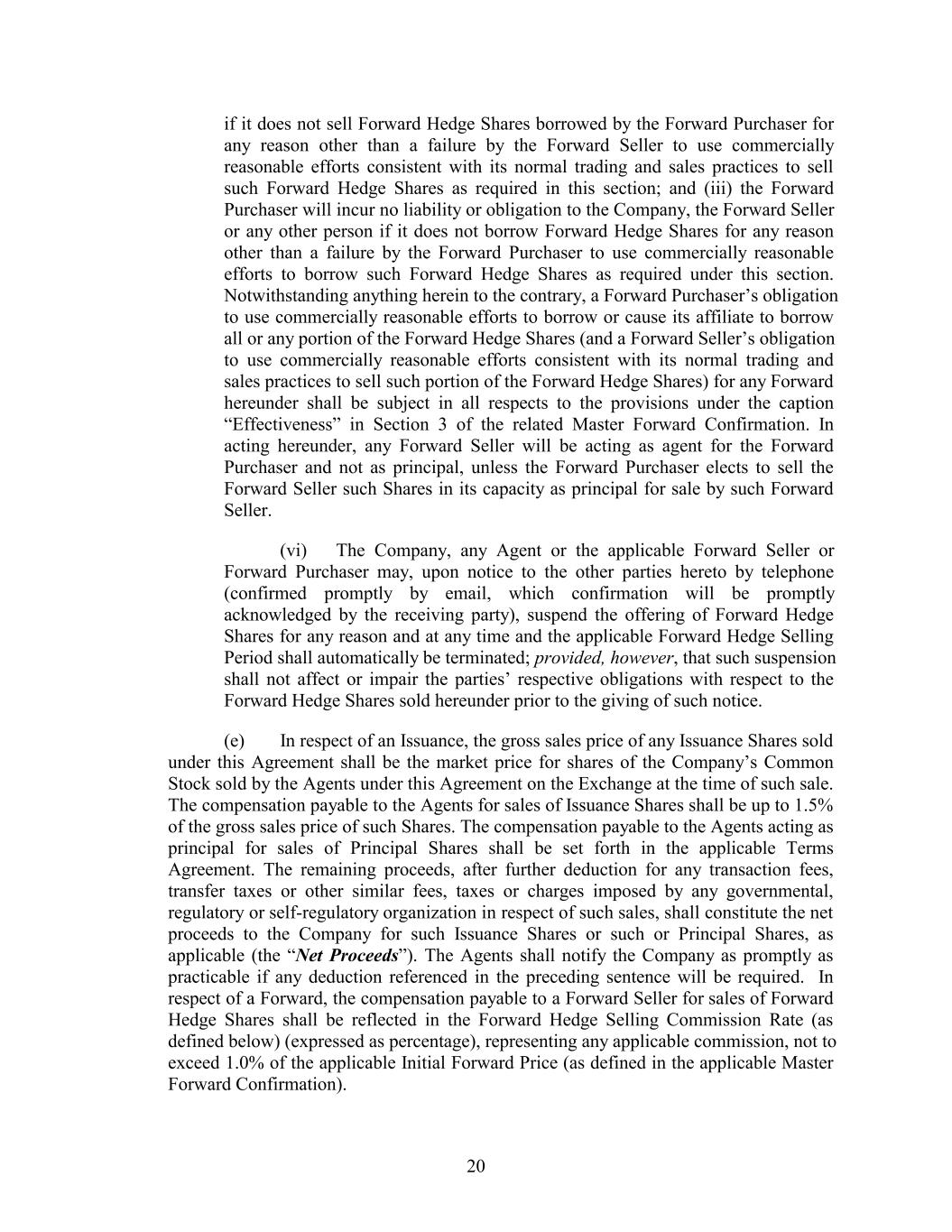 if it does not sell Forward Hedge Shares borrowed by the Forward Purchaser for any reason other than a failure by the Forward Seller to use commercially reasonable efforts consistent with its normal trading and sales practices to sell such Forward Hedge Shares as required in this section; and (iii) the Forward Purchaser will incur no liability or obligation to the Company, the Forward Seller or any other person if it does not borrow Forward Hedge Shares for any reason other than a failure by the Forward Purchaser to use commercially reasonable efforts to borrow such Forward Hedge Shares as required under this section. Notwithstanding anything herein to the contrary, a Forward Purchaser’s obligation to use commercially reasonable efforts to borrow or cause its affiliate to borrow all or any portion of the Forward Hedge Shares (and a Forward Seller’s obligation to use commercially reasonable efforts consistent with its normal trading and sales practices to sell such portion of the Forward Hedge Shares) for any Forward hereunder shall be subject in all respects to the provisions under the caption “Effectiveness” in Section 3 of the related Master Forward Confirmation. In acting hereunder, any Forward Seller will be acting as agent for the Forward Purchaser and not as principal, unless the Forward Purchaser elects to sell the Forward Seller such Shares in its capacity as principal for sale by such Forward Seller. (vi) The Company, any Agent or the applicable Forward Seller or Forward Purchaser may, upon notice to the other parties hereto by telephone (confirmed promptly by email, which confirmation will be promptly acknowledged by the receiving party), suspend the offering of Forward Hedge Shares for any reason and at any time and the applicable Forward Hedge Selling Period shall automatically be terminated; provided, however, that such suspension shall not affect or impair the parties’ respective obligations with respect to the Forward Hedge Shares sold hereunder prior to the giving of such notice. (e) In respect of an Issuance, the gross sales price of any Issuance Shares sold under this Agreement shall be the market price for shares of the Company’s Common Stock sold by the Agents under this Agreement on the Exchange at the time of such sale. The compensation payable to the Agents for sales of Issuance Shares shall be up to 1.5% of the gross sales price of such Shares. The compensation payable to the Agents acting as principal for sales of Principal Shares shall be set forth in the applicable Terms Agreement. The remaining proceeds, after further deduction for any transaction fees, transfer taxes or other similar fees, taxes or charges imposed by any governmental, regulatory or self-regulatory organization in respect of such sales, shall constitute the net proceeds to the Company for such Issuance Shares or such or Principal Shares, as applicable (the “Net Proceeds”). The Agents shall notify the Company as promptly as practicable if any deduction referenced in the preceding sentence will be required. In respect of a Forward, the compensation payable to a Forward Seller for sales of Forward Hedge Shares shall be reflected in the Forward Hedge Selling Commission Rate (as defined below) (expressed as percentage), representing any applicable commission, not to exceed 1.0% of the applicable Initial Forward Price (as defined in the applicable Master Forward Confirmation). 20