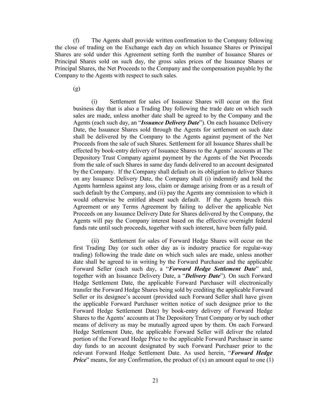 (f) The Agents shall provide written confirmation to the Company following the close of trading on the Exchange each day on which Issuance Shares or Principal Shares are sold under this Agreement setting forth the number of Issuance Shares or Principal Shares sold on such day, the gross sales prices of the Issuance Shares or Principal Shares, the Net Proceeds to the Company and the compensation payable by the Company to the Agents with respect to such sales. (g) (i) Settlement for sales of Issuance Shares will occur on the first business day that is also a Trading Day following the trade date on which such sales are made, unless another date shall be agreed to by the Company and the Agents (each such day, an “Issuance Delivery Date”). On each Issuance Delivery Date, the Issuance Shares sold through the Agents for settlement on such date shall be delivered by the Company to the Agents against payment of the Net Proceeds from the sale of such Shares. Settlement for all Issuance Shares shall be effected by book-entry delivery of Issuance Shares to the Agents’ accounts at The Depository Trust Company against payment by the Agents of the Net Proceeds from the sale of such Shares in same day funds delivered to an account designated by the Company. If the Company shall default on its obligation to deliver Shares on any Issuance Delivery Date, the Company shall (i) indemnify and hold the Agents harmless against any loss, claim or damage arising from or as a result of such default by the Company, and (ii) pay the Agents any commission to which it would otherwise be entitled absent such default. If the Agents breach this Agreement or any Terms Agreement by failing to deliver the applicable Net Proceeds on any Issuance Delivery Date for Shares delivered by the Company, the Agents will pay the Company interest based on the effective overnight federal funds rate until such proceeds, together with such interest, have been fully paid. (ii) Settlement for sales of Forward Hedge Shares will occur on the first Trading Day (or such other day as is industry practice for regular-way trading) following the trade date on which such sales are made, unless another date shall be agreed to in writing by the Forward Purchaser and the applicable Forward Seller (each such day, a “Forward Hedge Settlement Date” and, together with an Issuance Delivery Date, a “Delivery Date”). On such Forward Hedge Settlement Date, the applicable Forward Purchaser will electronically transfer the Forward Hedge Shares being sold by crediting the applicable Forward Seller or its designee’s account (provided such Forward Seller shall have given the applicable Forward Purchaser written notice of such designee prior to the Forward Hedge Settlement Date) by book-entry delivery of Forward Hedge Shares to the Agents’ accounts at The Depository Trust Company or by such other means of delivery as may be mutually agreed upon by them. On each Forward Hedge Settlement Date, the applicable Forward Seller will deliver the related portion of the Forward Hedge Price to the applicable Forward Purchaser in same day funds to an account designated by such Forward Purchaser prior to the relevant Forward Hedge Settlement Date. As used herein, “Forward Hedge Price” means, for any Confirmation, the product of (x) an amount equal to one (1) 21