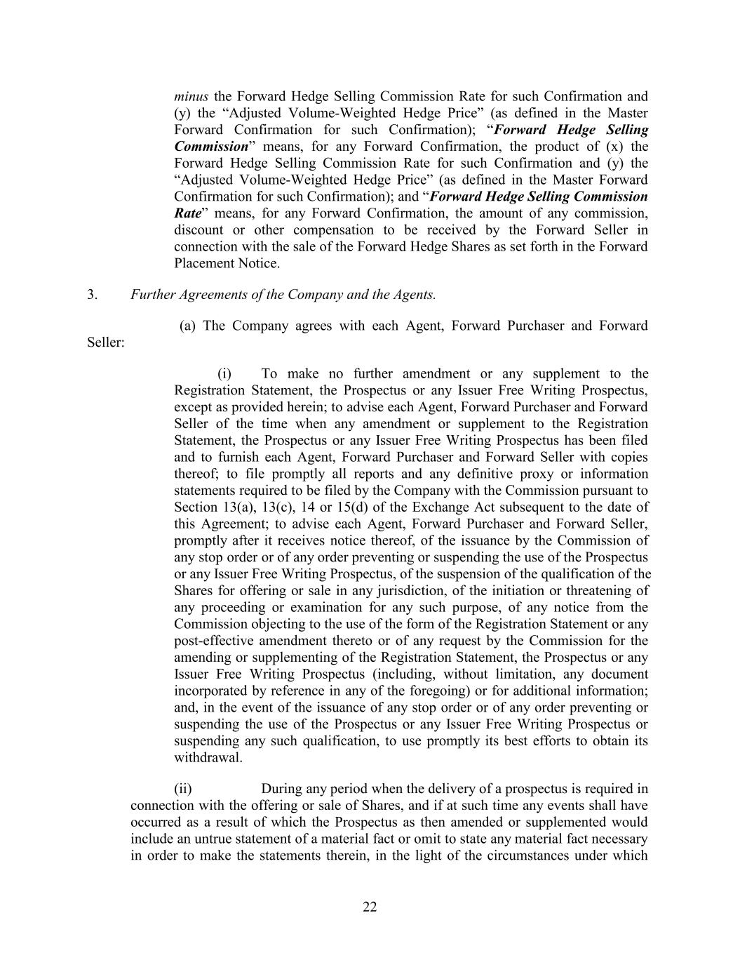 minus the Forward Hedge Selling Commission Rate for such Confirmation and (y) the “Adjusted Volume-Weighted Hedge Price” (as defined in the Master Forward Confirmation for such Confirmation); “Forward Hedge Selling Commission” means, for any Forward Confirmation, the product of (x) the Forward Hedge Selling Commission Rate for such Confirmation and (y) the “Adjusted Volume-Weighted Hedge Price” (as defined in the Master Forward Confirmation for such Confirmation); and “Forward Hedge Selling Commission Rate” means, for any Forward Confirmation, the amount of any commission, discount or other compensation to be received by the Forward Seller in connection with the sale of the Forward Hedge Shares as set forth in the Forward Placement Notice. 3. Further Agreements of the Company and the Agents. (a) The Company agrees with each Agent, Forward Purchaser and Forward Seller: (i) To make no further amendment or any supplement to the Registration Statement, the Prospectus or any Issuer Free Writing Prospectus, except as provided herein; to advise each Agent, Forward Purchaser and Forward Seller of the time when any amendment or supplement to the Registration Statement, the Prospectus or any Issuer Free Writing Prospectus has been filed and to furnish each Agent, Forward Purchaser and Forward Seller with copies thereof; to file promptly all reports and any definitive proxy or information statements required to be filed by the Company with the Commission pursuant to Section 13(a), 13(c), 14 or 15(d) of the Exchange Act subsequent to the date of this Agreement; to advise each Agent, Forward Purchaser and Forward Seller, promptly after it receives notice thereof, of the issuance by the Commission of any stop order or of any order preventing or suspending the use of the Prospectus or any Issuer Free Writing Prospectus, of the suspension of the qualification of the Shares for offering or sale in any jurisdiction, of the initiation or threatening of any proceeding or examination for any such purpose, of any notice from the Commission objecting to the use of the form of the Registration Statement or any post-effective amendment thereto or of any request by the Commission for the amending or supplementing of the Registration Statement, the Prospectus or any Issuer Free Writing Prospectus (including, without limitation, any document incorporated by reference in any of the foregoing) or for additional information; and, in the event of the issuance of any stop order or of any order preventing or suspending the use of the Prospectus or any Issuer Free Writing Prospectus or suspending any such qualification, to use promptly its best efforts to obtain its withdrawal. (ii) During any period when the delivery of a prospectus is required in connection with the offering or sale of Shares, and if at such time any events shall have occurred as a result of which the Prospectus as then amended or supplemented would include an untrue statement of a material fact or omit to state any material fact necessary in order to make the statements therein, in the light of the circumstances under which 22