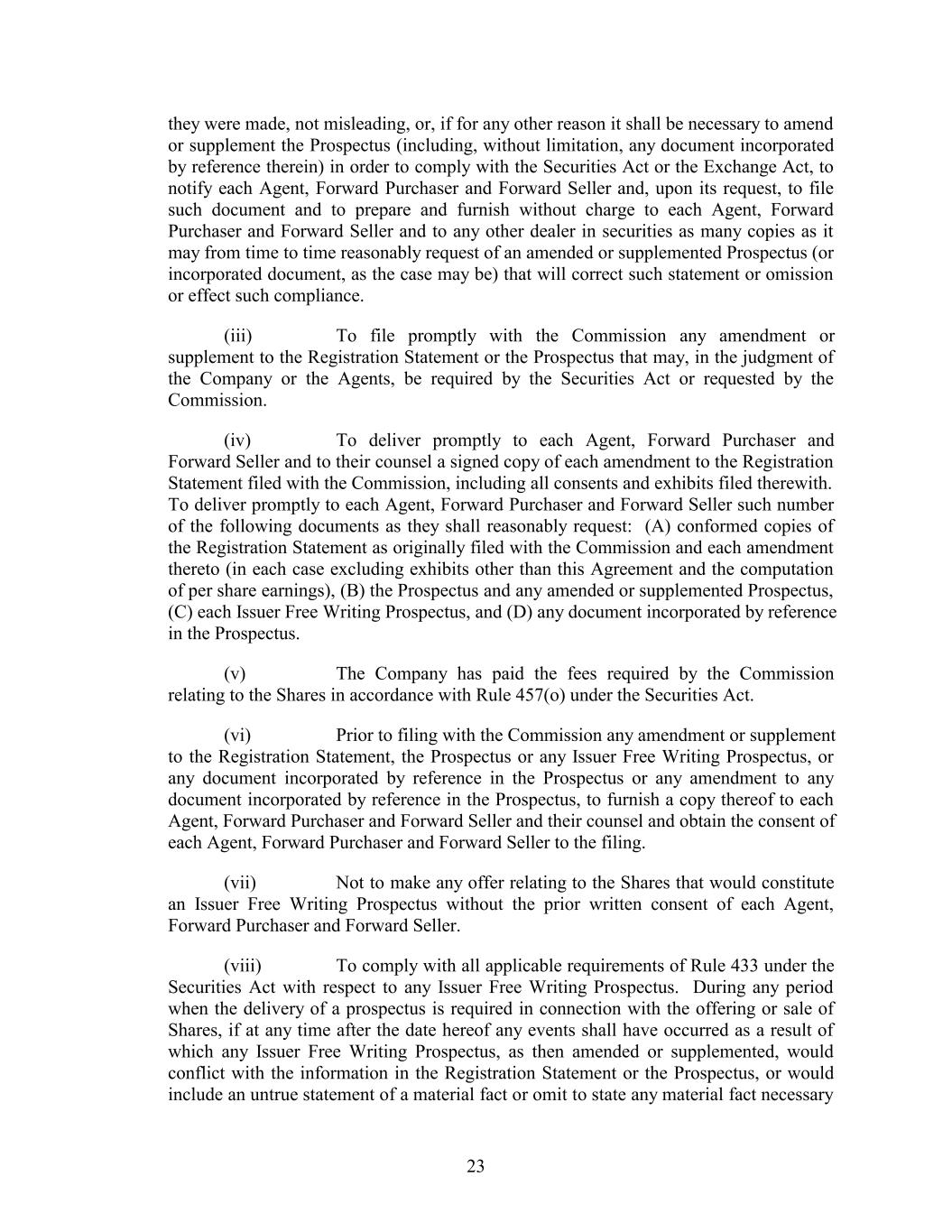 they were made, not misleading, or, if for any other reason it shall be necessary to amend or supplement the Prospectus (including, without limitation, any document incorporated by reference therein) in order to comply with the Securities Act or the Exchange Act, to notify each Agent, Forward Purchaser and Forward Seller and, upon its request, to file such document and to prepare and furnish without charge to each Agent, Forward Purchaser and Forward Seller and to any other dealer in securities as many copies as it may from time to time reasonably request of an amended or supplemented Prospectus (or incorporated document, as the case may be) that will correct such statement or omission or effect such compliance. (iii) To file promptly with the Commission any amendment or supplement to the Registration Statement or the Prospectus that may, in the judgment of the Company or the Agents, be required by the Securities Act or requested by the Commission. (iv) To deliver promptly to each Agent, Forward Purchaser and Forward Seller and to their counsel a signed copy of each amendment to the Registration Statement filed with the Commission, including all consents and exhibits filed therewith. To deliver promptly to each Agent, Forward Purchaser and Forward Seller such number of the following documents as they shall reasonably request: (A) conformed copies of the Registration Statement as originally filed with the Commission and each amendment thereto (in each case excluding exhibits other than this Agreement and the computation of per share earnings), (B) the Prospectus and any amended or supplemented Prospectus, (C) each Issuer Free Writing Prospectus, and (D) any document incorporated by reference in the Prospectus. (v) The Company has paid the fees required by the Commission relating to the Shares in accordance with Rule 457(o) under the Securities Act. (vi) Prior to filing with the Commission any amendment or supplement to the Registration Statement, the Prospectus or any Issuer Free Writing Prospectus, or any document incorporated by reference in the Prospectus or any amendment to any document incorporated by reference in the Prospectus, to furnish a copy thereof to each Agent, Forward Purchaser and Forward Seller and their counsel and obtain the consent of each Agent, Forward Purchaser and Forward Seller to the filing. (vii) Not to make any offer relating to the Shares that would constitute an Issuer Free Writing Prospectus without the prior written consent of each Agent, Forward Purchaser and Forward Seller. (viii) To comply with all applicable requirements of Rule 433 under the Securities Act with respect to any Issuer Free Writing Prospectus. During any period when the delivery of a prospectus is required in connection with the offering or sale of Shares, if at any time after the date hereof any events shall have occurred as a result of which any Issuer Free Writing Prospectus, as then amended or supplemented, would conflict with the information in the Registration Statement or the Prospectus, or would include an untrue statement of a material fact or omit to state any material fact necessary 23