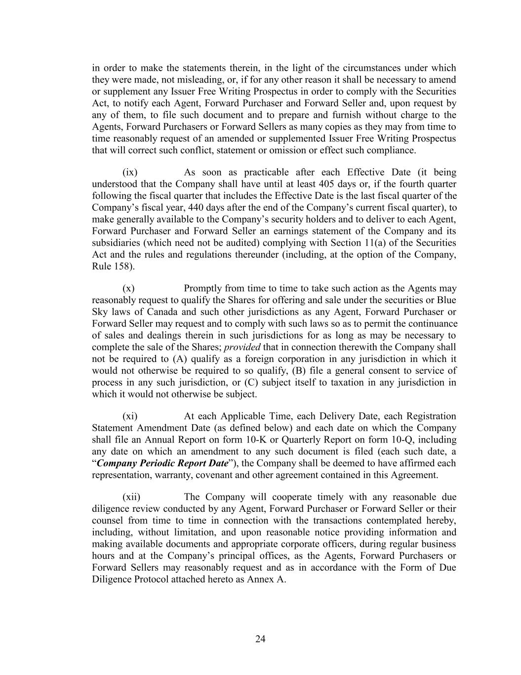 in order to make the statements therein, in the light of the circumstances under which they were made, not misleading, or, if for any other reason it shall be necessary to amend or supplement any Issuer Free Writing Prospectus in order to comply with the Securities Act, to notify each Agent, Forward Purchaser and Forward Seller and, upon request by any of them, to file such document and to prepare and furnish without charge to the Agents, Forward Purchasers or Forward Sellers as many copies as they may from time to time reasonably request of an amended or supplemented Issuer Free Writing Prospectus that will correct such conflict, statement or omission or effect such compliance. (ix) As soon as practicable after each Effective Date (it being understood that the Company shall have until at least 405 days or, if the fourth quarter following the fiscal quarter that includes the Effective Date is the last fiscal quarter of the Company’s fiscal year, 440 days after the end of the Company’s current fiscal quarter), to make generally available to the Company’s security holders and to deliver to each Agent, Forward Purchaser and Forward Seller an earnings statement of the Company and its subsidiaries (which need not be audited) complying with Section 11(a) of the Securities Act and the rules and regulations thereunder (including, at the option of the Company, Rule 158). (x) Promptly from time to time to take such action as the Agents may reasonably request to qualify the Shares for offering and sale under the securities or Blue Sky laws of Canada and such other jurisdictions as any Agent, Forward Purchaser or Forward Seller may request and to comply with such laws so as to permit the continuance of sales and dealings therein in such jurisdictions for as long as may be necessary to complete the sale of the Shares; provided that in connection therewith the Company shall not be required to (A) qualify as a foreign corporation in any jurisdiction in which it would not otherwise be required to so qualify, (B) file a general consent to service of process in any such jurisdiction, or (C) subject itself to taxation in any jurisdiction in which it would not otherwise be subject. (xi) At each Applicable Time, each Delivery Date, each Registration Statement Amendment Date (as defined below) and each date on which the Company shall file an Annual Report on form 10-K or Quarterly Report on form 10-Q, including any date on which an amendment to any such document is filed (each such date, a “Company Periodic Report Date”), the Company shall be deemed to have affirmed each representation, warranty, covenant and other agreement contained in this Agreement. (xii) The Company will cooperate timely with any reasonable due diligence review conducted by any Agent, Forward Purchaser or Forward Seller or their counsel from time to time in connection with the transactions contemplated hereby, including, without limitation, and upon reasonable notice providing information and making available documents and appropriate corporate officers, during regular business hours and at the Company’s principal offices, as the Agents, Forward Purchasers or Forward Sellers may reasonably request and as in accordance with the Form of Due Diligence Protocol attached hereto as Annex A. 24