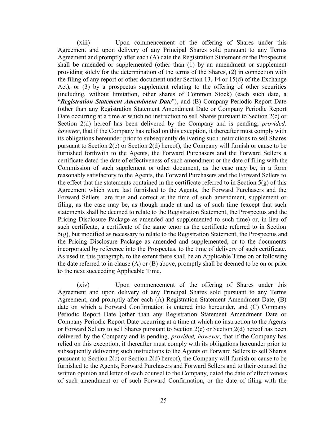 (xiii) Upon commencement of the offering of Shares under this Agreement and upon delivery of any Principal Shares sold pursuant to any Terms Agreement and promptly after each (A) date the Registration Statement or the Prospectus shall be amended or supplemented (other than (1) by an amendment or supplement providing solely for the determination of the terms of the Shares, (2) in connection with the filing of any report or other document under Section 13, 14 or 15(d) of the Exchange Act), or (3) by a prospectus supplement relating to the offering of other securities (including, without limitation, other shares of Common Stock) (each such date, a “Registration Statement Amendment Date”), and (B) Company Periodic Report Date (other than any Registration Statement Amendment Date or Company Periodic Report Date occurring at a time at which no instruction to sell Shares pursuant to Section 2(c) or Section 2(d) hereof has been delivered by the Company and is pending; provided, however, that if the Company has relied on this exception, it thereafter must comply with its obligations hereunder prior to subsequently delivering such instructions to sell Shares pursuant to Section 2(c) or Section 2(d) hereof), the Company will furnish or cause to be furnished forthwith to the Agents, the Forward Purchasers and the Forward Sellers a certificate dated the date of effectiveness of such amendment or the date of filing with the Commission of such supplement or other document, as the case may be, in a form reasonably satisfactory to the Agents, the Forward Purchasers and the Forward Sellers to the effect that the statements contained in the certificate referred to in Section 5(g) of this Agreement which were last furnished to the Agents, the Forward Purchasers and the Forward Sellers are true and correct at the time of such amendment, supplement or filing, as the case may be, as though made at and as of such time (except that such statements shall be deemed to relate to the Registration Statement, the Prospectus and the Pricing Disclosure Package as amended and supplemented to such time) or, in lieu of such certificate, a certificate of the same tenor as the certificate referred to in Section 5(g), but modified as necessary to relate to the Registration Statement, the Prospectus and the Pricing Disclosure Package as amended and supplemented, or to the documents incorporated by reference into the Prospectus, to the time of delivery of such certificate. As used in this paragraph, to the extent there shall be an Applicable Time on or following the date referred to in clause (A) or (B) above, promptly shall be deemed to be on or prior to the next succeeding Applicable Time. (xiv) Upon commencement of the offering of Shares under this Agreement and upon delivery of any Principal Shares sold pursuant to any Terms Agreement, and promptly after each (A) Registration Statement Amendment Date, (B) date on which a Forward Confirmation is entered into hereunder, and (C) Company Periodic Report Date (other than any Registration Statement Amendment Date or Company Periodic Report Date occurring at a time at which no instruction to the Agents or Forward Sellers to sell Shares pursuant to Section 2(c) or Section 2(d) hereof has been delivered by the Company and is pending, provided, however, that if the Company has relied on this exception, it thereafter must comply with its obligations hereunder prior to subsequently delivering such instructions to the Agents or Forward Sellers to sell Shares pursuant to Section 2(c) or Section 2(d) hereof), the Company will furnish or cause to be furnished to the Agents, Forward Purchasers and Forward Sellers and to their counsel the written opinion and letter of each counsel to the Company, dated the date of effectiveness of such amendment or of such Forward Confirmation, or the date of filing with the 25