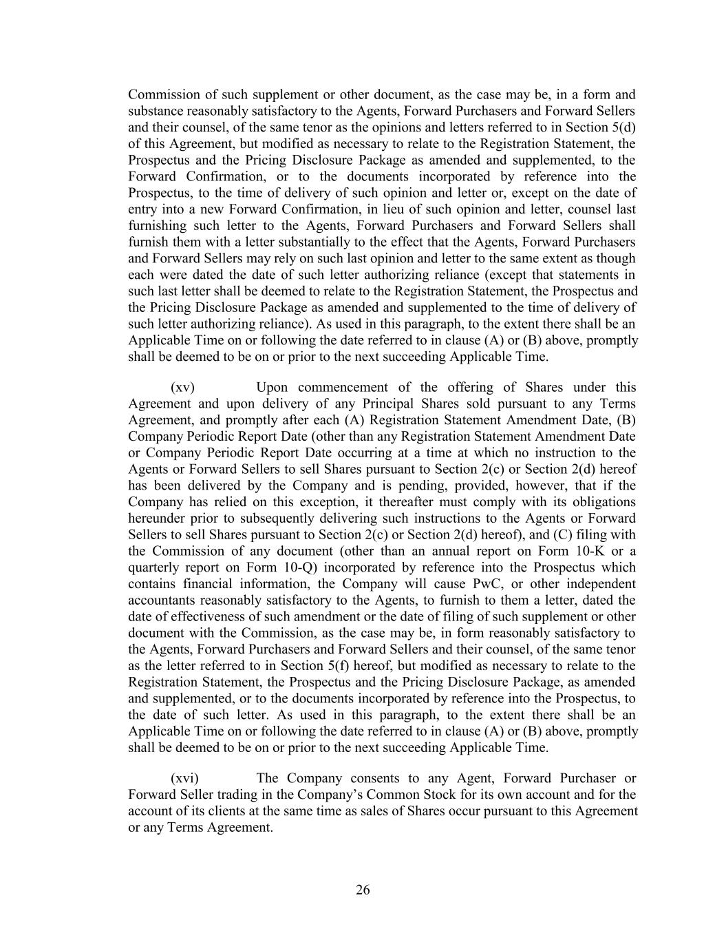 Commission of such supplement or other document, as the case may be, in a form and substance reasonably satisfactory to the Agents, Forward Purchasers and Forward Sellers and their counsel, of the same tenor as the opinions and letters referred to in Section 5(d) of this Agreement, but modified as necessary to relate to the Registration Statement, the Prospectus and the Pricing Disclosure Package as amended and supplemented, to the Forward Confirmation, or to the documents incorporated by reference into the Prospectus, to the time of delivery of such opinion and letter or, except on the date of entry into a new Forward Confirmation, in lieu of such opinion and letter, counsel last furnishing such letter to the Agents, Forward Purchasers and Forward Sellers shall furnish them with a letter substantially to the effect that the Agents, Forward Purchasers and Forward Sellers may rely on such last opinion and letter to the same extent as though each were dated the date of such letter authorizing reliance (except that statements in such last letter shall be deemed to relate to the Registration Statement, the Prospectus and the Pricing Disclosure Package as amended and supplemented to the time of delivery of such letter authorizing reliance). As used in this paragraph, to the extent there shall be an Applicable Time on or following the date referred to in clause (A) or (B) above, promptly shall be deemed to be on or prior to the next succeeding Applicable Time. (xv) Upon commencement of the offering of Shares under this Agreement and upon delivery of any Principal Shares sold pursuant to any Terms Agreement, and promptly after each (A) Registration Statement Amendment Date, (B) Company Periodic Report Date (other than any Registration Statement Amendment Date or Company Periodic Report Date occurring at a time at which no instruction to the Agents or Forward Sellers to sell Shares pursuant to Section 2(c) or Section 2(d) hereof has been delivered by the Company and is pending, provided, however, that if the Company has relied on this exception, it thereafter must comply with its obligations hereunder prior to subsequently delivering such instructions to the Agents or Forward Sellers to sell Shares pursuant to Section 2(c) or Section 2(d) hereof), and (C) filing with the Commission of any document (other than an annual report on Form 10-K or a quarterly report on Form 10-Q) incorporated by reference into the Prospectus which contains financial information, the Company will cause PwC, or other independent accountants reasonably satisfactory to the Agents, to furnish to them a letter, dated the date of effectiveness of such amendment or the date of filing of such supplement or other document with the Commission, as the case may be, in form reasonably satisfactory to the Agents, Forward Purchasers and Forward Sellers and their counsel, of the same tenor as the letter referred to in Section 5(f) hereof, but modified as necessary to relate to the Registration Statement, the Prospectus and the Pricing Disclosure Package, as amended and supplemented, or to the documents incorporated by reference into the Prospectus, to the date of such letter. As used in this paragraph, to the extent there shall be an Applicable Time on or following the date referred to in clause (A) or (B) above, promptly shall be deemed to be on or prior to the next succeeding Applicable Time. (xvi) The Company consents to any Agent, Forward Purchaser or Forward Seller trading in the Company’s Common Stock for its own account and for the account of its clients at the same time as sales of Shares occur pursuant to this Agreement or any Terms Agreement. 26