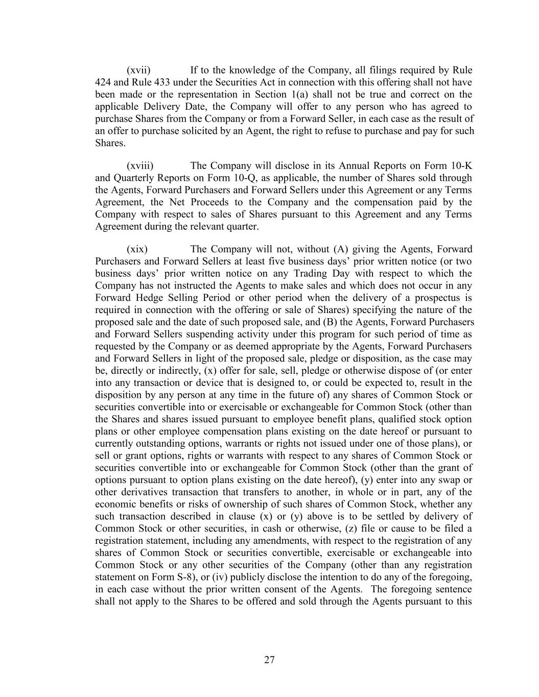(xvii) If to the knowledge of the Company, all filings required by Rule 424 and Rule 433 under the Securities Act in connection with this offering shall not have been made or the representation in Section 1(a) shall not be true and correct on the applicable Delivery Date, the Company will offer to any person who has agreed to purchase Shares from the Company or from a Forward Seller, in each case as the result of an offer to purchase solicited by an Agent, the right to refuse to purchase and pay for such Shares. (xviii) The Company will disclose in its Annual Reports on Form 10-K and Quarterly Reports on Form 10-Q, as applicable, the number of Shares sold through the Agents, Forward Purchasers and Forward Sellers under this Agreement or any Terms Agreement, the Net Proceeds to the Company and the compensation paid by the Company with respect to sales of Shares pursuant to this Agreement and any Terms Agreement during the relevant quarter. (xix) The Company will not, without (A) giving the Agents, Forward Purchasers and Forward Sellers at least five business days’ prior written notice (or two business days’ prior written notice on any Trading Day with respect to which the Company has not instructed the Agents to make sales and which does not occur in any Forward Hedge Selling Period or other period when the delivery of a prospectus is required in connection with the offering or sale of Shares) specifying the nature of the proposed sale and the date of such proposed sale, and (B) the Agents, Forward Purchasers and Forward Sellers suspending activity under this program for such period of time as requested by the Company or as deemed appropriate by the Agents, Forward Purchasers and Forward Sellers in light of the proposed sale, pledge or disposition, as the case may be, directly or indirectly, (x) offer for sale, sell, pledge or otherwise dispose of (or enter into any transaction or device that is designed to, or could be expected to, result in the disposition by any person at any time in the future of) any shares of Common Stock or securities convertible into or exercisable or exchangeable for Common Stock (other than the Shares and shares issued pursuant to employee benefit plans, qualified stock option plans or other employee compensation plans existing on the date hereof or pursuant to currently outstanding options, warrants or rights not issued under one of those plans), or sell or grant options, rights or warrants with respect to any shares of Common Stock or securities convertible into or exchangeable for Common Stock (other than the grant of options pursuant to option plans existing on the date hereof), (y) enter into any swap or other derivatives transaction that transfers to another, in whole or in part, any of the economic benefits or risks of ownership of such shares of Common Stock, whether any such transaction described in clause (x) or (y) above is to be settled by delivery of Common Stock or other securities, in cash or otherwise, (z) file or cause to be filed a registration statement, including any amendments, with respect to the registration of any shares of Common Stock or securities convertible, exercisable or exchangeable into Common Stock or any other securities of the Company (other than any registration statement on Form S-8), or (iv) publicly disclose the intention to do any of the foregoing, in each case without the prior written consent of the Agents. The foregoing sentence shall not apply to the Shares to be offered and sold through the Agents pursuant to this 27
