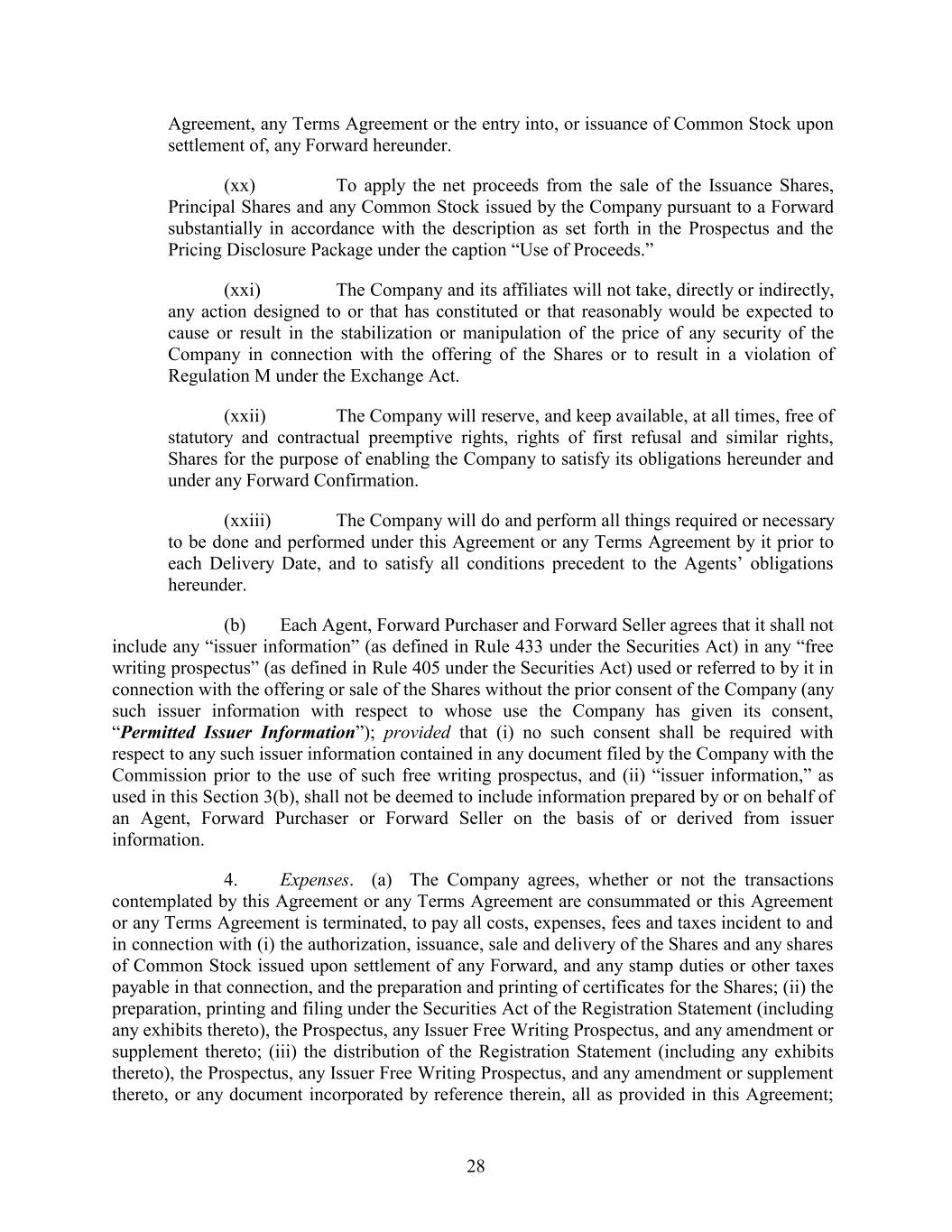 Agreement, any Terms Agreement or the entry into, or issuance of Common Stock upon settlement of, any Forward hereunder. (xx) To apply the net proceeds from the sale of the Issuance Shares, Principal Shares and any Common Stock issued by the Company pursuant to a Forward substantially in accordance with the description as set forth in the Prospectus and the Pricing Disclosure Package under the caption “Use of Proceeds.” (xxi) The Company and its affiliates will not take, directly or indirectly, any action designed to or that has constituted or that reasonably would be expected to cause or result in the stabilization or manipulation of the price of any security of the Company in connection with the offering of the Shares or to result in a violation of Regulation M under the Exchange Act. (xxii) The Company will reserve, and keep available, at all times, free of statutory and contractual preemptive rights, rights of first refusal and similar rights, Shares for the purpose of enabling the Company to satisfy its obligations hereunder and under any Forward Confirmation. (xxiii) The Company will do and perform all things required or necessary to be done and performed under this Agreement or any Terms Agreement by it prior to each Delivery Date, and to satisfy all conditions precedent to the Agents’ obligations hereunder. (b) Each Agent, Forward Purchaser and Forward Seller agrees that it shall not include any “issuer information” (as defined in Rule 433 under the Securities Act) in any “free writing prospectus” (as defined in Rule 405 under the Securities Act) used or referred to by it in connection with the offering or sale of the Shares without the prior consent of the Company (any such issuer information with respect to whose use the Company has given its consent, “Permitted Issuer Information”); provided that (i) no such consent shall be required with respect to any such issuer information contained in any document filed by the Company with the Commission prior to the use of such free writing prospectus, and (ii) “issuer information,” as used in this Section 3(b), shall not be deemed to include information prepared by or on behalf of an Agent, Forward Purchaser or Forward Seller on the basis of or derived from issuer information. 4. Expenses. (a) The Company agrees, whether or not the transactions contemplated by this Agreement or any Terms Agreement are consummated or this Agreement or any Terms Agreement is terminated, to pay all costs, expenses, fees and taxes incident to and in connection with (i) the authorization, issuance, sale and delivery of the Shares and any shares of Common Stock issued upon settlement of any Forward, and any stamp duties or other taxes payable in that connection, and the preparation and printing of certificates for the Shares; (ii) the preparation, printing and filing under the Securities Act of the Registration Statement (including any exhibits thereto), the Prospectus, any Issuer Free Writing Prospectus, and any amendment or supplement thereto; (iii) the distribution of the Registration Statement (including any exhibits thereto), the Prospectus, any Issuer Free Writing Prospectus, and any amendment or supplement thereto, or any document incorporated by reference therein, all as provided in this Agreement; 28