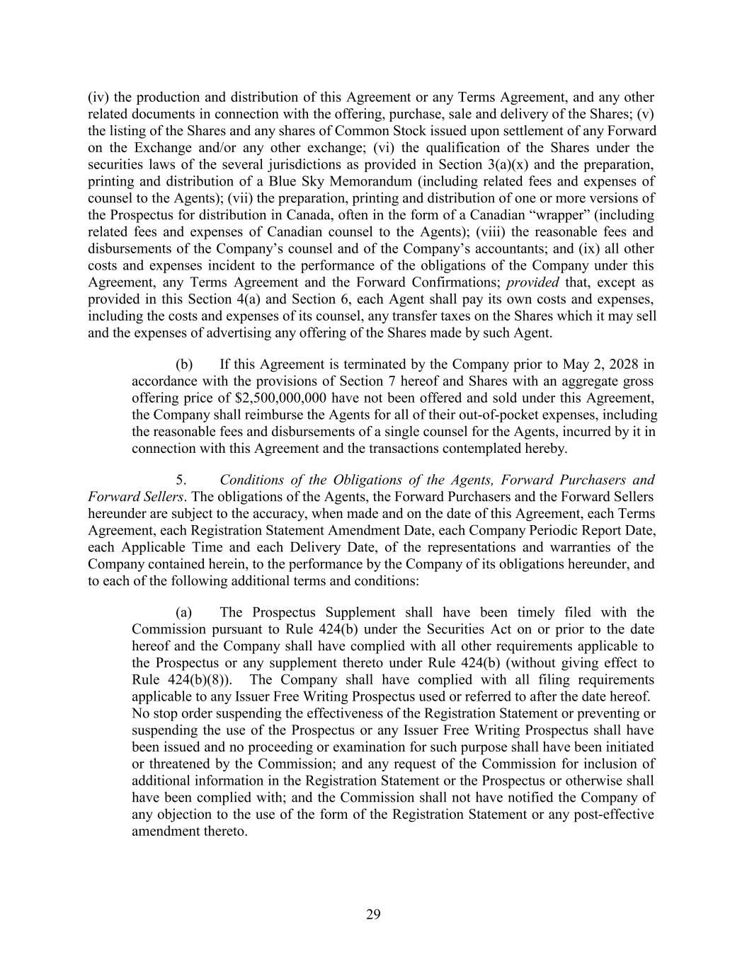 (iv) the production and distribution of this Agreement or any Terms Agreement, and any other related documents in connection with the offering, purchase, sale and delivery of the Shares; (v) the listing of the Shares and any shares of Common Stock issued upon settlement of any Forward on the Exchange and/or any other exchange; (vi) the qualification of the Shares under the securities laws of the several jurisdictions as provided in Section 3(a)(x) and the preparation, printing and distribution of a Blue Sky Memorandum (including related fees and expenses of counsel to the Agents); (vii) the preparation, printing and distribution of one or more versions of the Prospectus for distribution in Canada, often in the form of a Canadian “wrapper” (including related fees and expenses of Canadian counsel to the Agents); (viii) the reasonable fees and disbursements of the Company’s counsel and of the Company’s accountants; and (ix) all other costs and expenses incident to the performance of the obligations of the Company under this Agreement, any Terms Agreement and the Forward Confirmations; provided that, except as provided in this Section 4(a) and Section 6, each Agent shall pay its own costs and expenses, including the costs and expenses of its counsel, any transfer taxes on the Shares which it may sell and the expenses of advertising any offering of the Shares made by such Agent. (b) If this Agreement is terminated by the Company prior to May 2, 2028 in accordance with the provisions of Section 7 hereof and Shares with an aggregate gross offering price of $2,500,000,000 have not been offered and sold under this Agreement, the Company shall reimburse the Agents for all of their out-of-pocket expenses, including the reasonable fees and disbursements of a single counsel for the Agents, incurred by it in connection with this Agreement and the transactions contemplated hereby. 5. Conditions of the Obligations of the Agents, Forward Purchasers and Forward Sellers. The obligations of the Agents, the Forward Purchasers and the Forward Sellers hereunder are subject to the accuracy, when made and on the date of this Agreement, each Terms Agreement, each Registration Statement Amendment Date, each Company Periodic Report Date, each Applicable Time and each Delivery Date, of the representations and warranties of the Company contained herein, to the performance by the Company of its obligations hereunder, and to each of the following additional terms and conditions: (a) The Prospectus Supplement shall have been timely filed with the Commission pursuant to Rule 424(b) under the Securities Act on or prior to the date hereof and the Company shall have complied with all other requirements applicable to the Prospectus or any supplement thereto under Rule 424(b) (without giving effect to Rule 424(b)(8)). The Company shall have complied with all filing requirements applicable to any Issuer Free Writing Prospectus used or referred to after the date hereof. No stop order suspending the effectiveness of the Registration Statement or preventing or suspending the use of the Prospectus or any Issuer Free Writing Prospectus shall have been issued and no proceeding or examination for such purpose shall have been initiated or threatened by the Commission; and any request of the Commission for inclusion of additional information in the Registration Statement or the Prospectus or otherwise shall have been complied with; and the Commission shall not have notified the Company of any objection to the use of the form of the Registration Statement or any post-effective amendment thereto. 29
