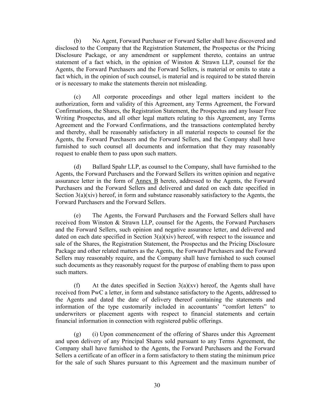 (b) No Agent, Forward Purchaser or Forward Seller shall have discovered and disclosed to the Company that the Registration Statement, the Prospectus or the Pricing Disclosure Package, or any amendment or supplement thereto, contains an untrue statement of a fact which, in the opinion of Winston & Strawn LLP, counsel for the Agents, the Forward Purchasers and the Forward Sellers, is material or omits to state a fact which, in the opinion of such counsel, is material and is required to be stated therein or is necessary to make the statements therein not misleading. (c) All corporate proceedings and other legal matters incident to the authorization, form and validity of this Agreement, any Terms Agreement, the Forward Confirmations, the Shares, the Registration Statement, the Prospectus and any Issuer Free Writing Prospectus, and all other legal matters relating to this Agreement, any Terms Agreement and the Forward Confirmations, and the transactions contemplated hereby and thereby, shall be reasonably satisfactory in all material respects to counsel for the Agents, the Forward Purchasers and the Forward Sellers, and the Company shall have furnished to such counsel all documents and information that they may reasonably request to enable them to pass upon such matters. (d) Ballard Spahr LLP, as counsel to the Company, shall have furnished to the Agents, the Forward Purchasers and the Forward Sellers its written opinion and negative assurance letter in the form of Annex B hereto, addressed to the Agents, the Forward Purchasers and the Forward Sellers and delivered and dated on each date specified in Section 3(a)(xiv) hereof, in form and substance reasonably satisfactory to the Agents, the Forward Purchasers and the Forward Sellers. (e) The Agents, the Forward Purchasers and the Forward Sellers shall have received from Winston & Strawn LLP, counsel for the Agents, the Forward Purchasers and the Forward Sellers, such opinion and negative assurance letter, and delivered and dated on each date specified in Section 3(a)(xiv) hereof, with respect to the issuance and sale of the Shares, the Registration Statement, the Prospectus and the Pricing Disclosure Package and other related matters as the Agents, the Forward Purchasers and the Forward Sellers may reasonably require, and the Company shall have furnished to such counsel such documents as they reasonably request for the purpose of enabling them to pass upon such matters. (f) At the dates specified in Section 3(a)(xv) hereof, the Agents shall have received from PwC a letter, in form and substance satisfactory to the Agents, addressed to the Agents and dated the date of delivery thereof containing the statements and information of the type customarily included in accountants’ “comfort letters” to underwriters or placement agents with respect to financial statements and certain financial information in connection with registered public offerings. (g) (i) Upon commencement of the offering of Shares under this Agreement and upon delivery of any Principal Shares sold pursuant to any Terms Agreement, the Company shall have furnished to the Agents, the Forward Purchasers and the Forward Sellers a certificate of an officer in a form satisfactory to them stating the minimum price for the sale of such Shares pursuant to this Agreement and the maximum number of 30