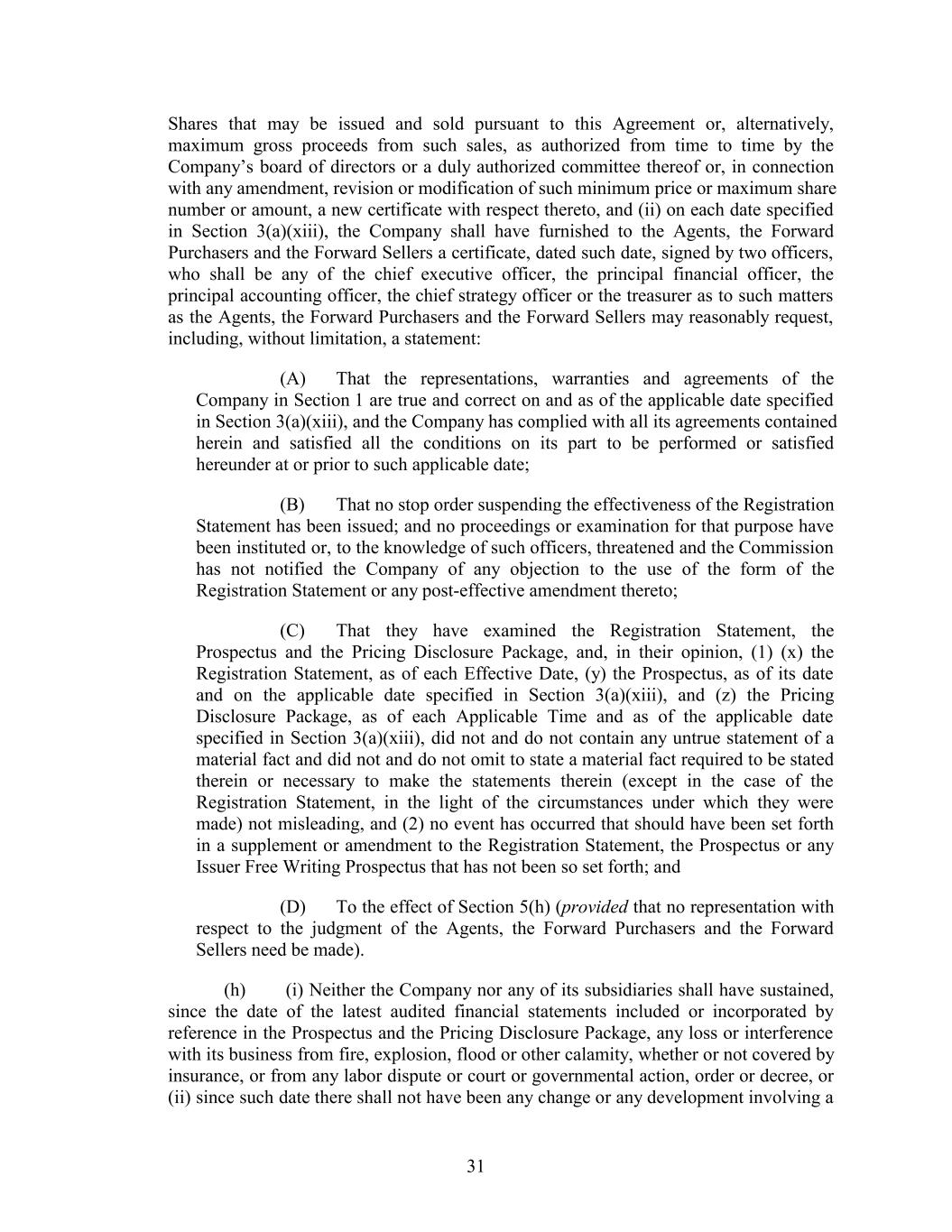 Shares that may be issued and sold pursuant to this Agreement or, alternatively, maximum gross proceeds from such sales, as authorized from time to time by the Company’s board of directors or a duly authorized committee thereof or, in connection with any amendment, revision or modification of such minimum price or maximum share number or amount, a new certificate with respect thereto, and (ii) on each date specified in Section 3(a)(xiii), the Company shall have furnished to the Agents, the Forward Purchasers and the Forward Sellers a certificate, dated such date, signed by two officers, who shall be any of the chief executive officer, the principal financial officer, the principal accounting officer, the chief strategy officer or the treasurer as to such matters as the Agents, the Forward Purchasers and the Forward Sellers may reasonably request, including, without limitation, a statement: (A) That the representations, warranties and agreements of the Company in Section 1 are true and correct on and as of the applicable date specified in Section 3(a)(xiii), and the Company has complied with all its agreements contained herein and satisfied all the conditions on its part to be performed or satisfied hereunder at or prior to such applicable date; (B) That no stop order suspending the effectiveness of the Registration Statement has been issued; and no proceedings or examination for that purpose have been instituted or, to the knowledge of such officers, threatened and the Commission has not notified the Company of any objection to the use of the form of the Registration Statement or any post-effective amendment thereto; (C) That they have examined the Registration Statement, the Prospectus and the Pricing Disclosure Package, and, in their opinion, (1) (x) the Registration Statement, as of each Effective Date, (y) the Prospectus, as of its date and on the applicable date specified in Section 3(a)(xiii), and (z) the Pricing Disclosure Package, as of each Applicable Time and as of the applicable date specified in Section 3(a)(xiii), did not and do not contain any untrue statement of a material fact and did not and do not omit to state a material fact required to be stated therein or necessary to make the statements therein (except in the case of the Registration Statement, in the light of the circumstances under which they were made) not misleading, and (2) no event has occurred that should have been set forth in a supplement or amendment to the Registration Statement, the Prospectus or any Issuer Free Writing Prospectus that has not been so set forth; and (D) To the effect of Section 5(h) (provided that no representation with respect to the judgment of the Agents, the Forward Purchasers and the Forward Sellers need be made). (h) (i) Neither the Company nor any of its subsidiaries shall have sustained, since the date of the latest audited financial statements included or incorporated by reference in the Prospectus and the Pricing Disclosure Package, any loss or interference with its business from fire, explosion, flood or other calamity, whether or not covered by insurance, or from any labor dispute or court or governmental action, order or decree, or (ii) since such date there shall not have been any change or any development involving a 31