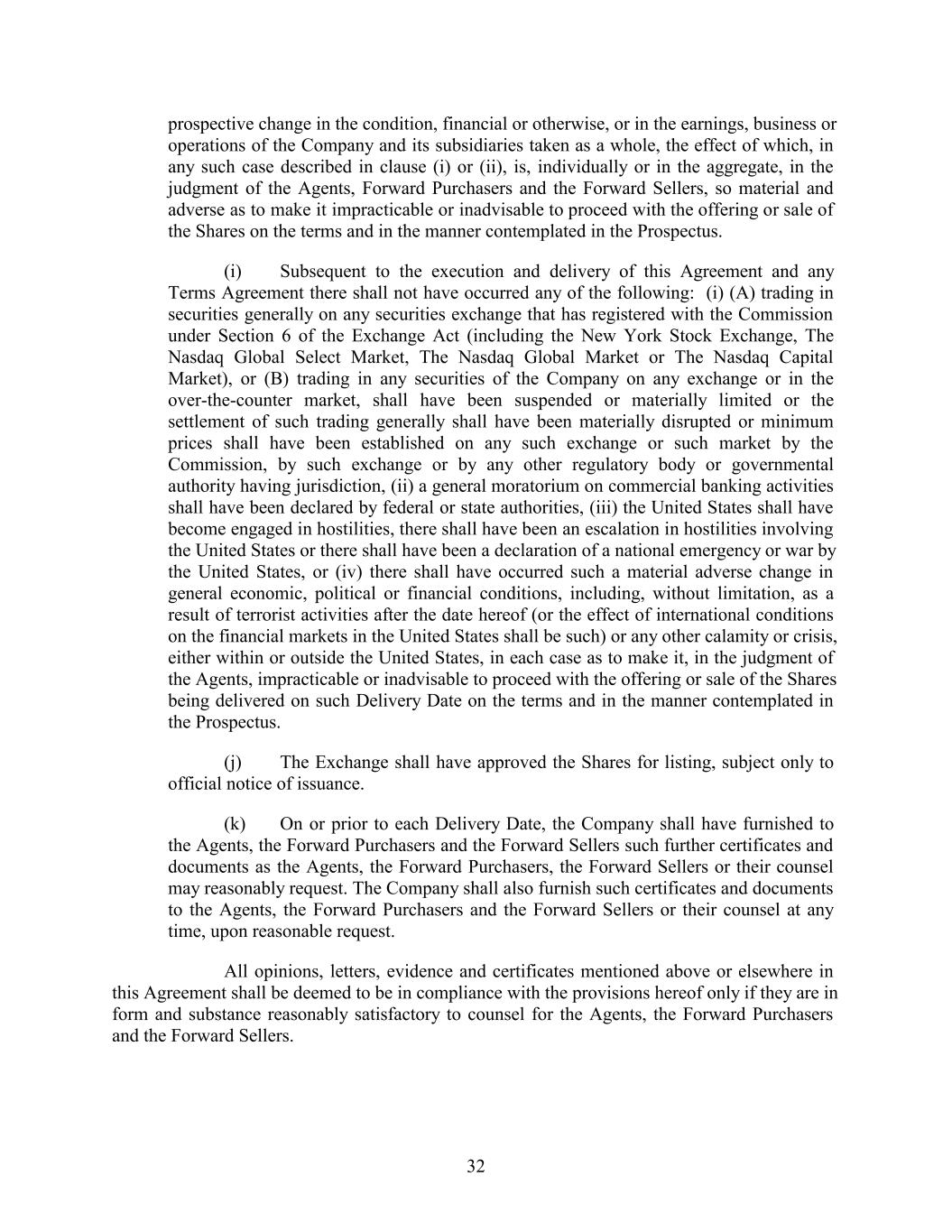 prospective change in the condition, financial or otherwise, or in the earnings, business or operations of the Company and its subsidiaries taken as a whole, the effect of which, in any such case described in clause (i) or (ii), is, individually or in the aggregate, in the judgment of the Agents, Forward Purchasers and the Forward Sellers, so material and adverse as to make it impracticable or inadvisable to proceed with the offering or sale of the Shares on the terms and in the manner contemplated in the Prospectus. (i) Subsequent to the execution and delivery of this Agreement and any Terms Agreement there shall not have occurred any of the following: (i) (A) trading in securities generally on any securities exchange that has registered with the Commission under Section 6 of the Exchange Act (including the New York Stock Exchange, The Nasdaq Global Select Market, The Nasdaq Global Market or The Nasdaq Capital Market), or (B) trading in any securities of the Company on any exchange or in the over-the-counter market, shall have been suspended or materially limited or the settlement of such trading generally shall have been materially disrupted or minimum prices shall have been established on any such exchange or such market by the Commission, by such exchange or by any other regulatory body or governmental authority having jurisdiction, (ii) a general moratorium on commercial banking activities shall have been declared by federal or state authorities, (iii) the United States shall have become engaged in hostilities, there shall have been an escalation in hostilities involving the United States or there shall have been a declaration of a national emergency or war by the United States, or (iv) there shall have occurred such a material adverse change in general economic, political or financial conditions, including, without limitation, as a result of terrorist activities after the date hereof (or the effect of international conditions on the financial markets in the United States shall be such) or any other calamity or crisis, either within or outside the United States, in each case as to make it, in the judgment of the Agents, impracticable or inadvisable to proceed with the offering or sale of the Shares being delivered on such Delivery Date on the terms and in the manner contemplated in the Prospectus. (j) The Exchange shall have approved the Shares for listing, subject only to official notice of issuance. (k) On or prior to each Delivery Date, the Company shall have furnished to the Agents, the Forward Purchasers and the Forward Sellers such further certificates and documents as the Agents, the Forward Purchasers, the Forward Sellers or their counsel may reasonably request. The Company shall also furnish such certificates and documents to the Agents, the Forward Purchasers and the Forward Sellers or their counsel at any time, upon reasonable request. All opinions, letters, evidence and certificates mentioned above or elsewhere in this Agreement shall be deemed to be in compliance with the provisions hereof only if they are in form and substance reasonably satisfactory to counsel for the Agents, the Forward Purchasers and the Forward Sellers. 32