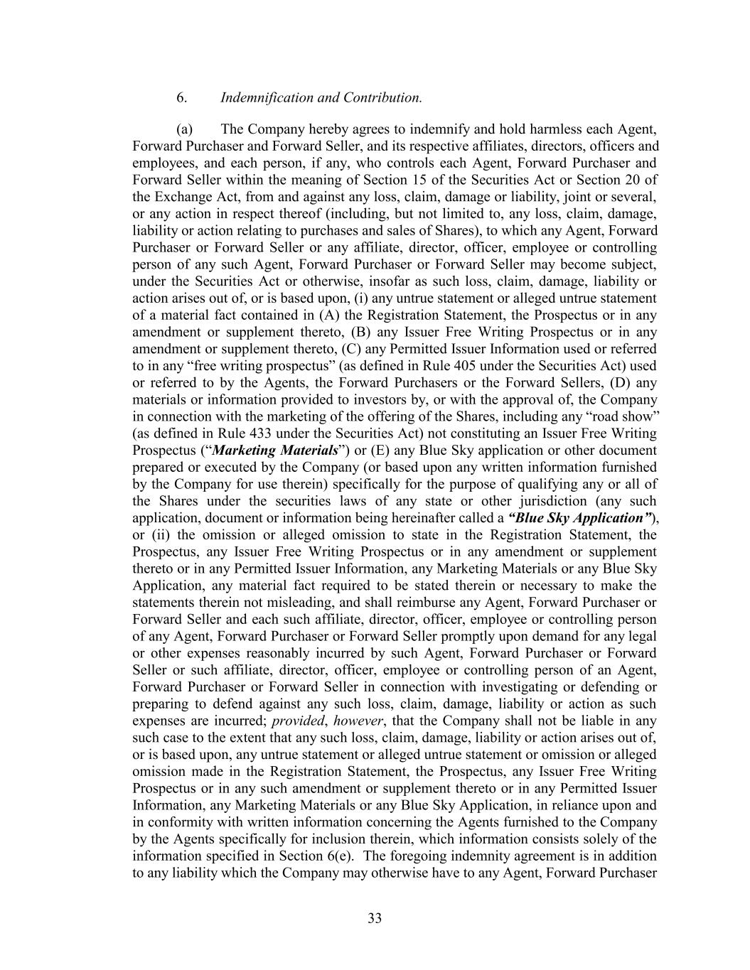 6. Indemnification and Contribution. (a) The Company hereby agrees to indemnify and hold harmless each Agent, Forward Purchaser and Forward Seller, and its respective affiliates, directors, officers and employees, and each person, if any, who controls each Agent, Forward Purchaser and Forward Seller within the meaning of Section 15 of the Securities Act or Section 20 of the Exchange Act, from and against any loss, claim, damage or liability, joint or several, or any action in respect thereof (including, but not limited to, any loss, claim, damage, liability or action relating to purchases and sales of Shares), to which any Agent, Forward Purchaser or Forward Seller or any affiliate, director, officer, employee or controlling person of any such Agent, Forward Purchaser or Forward Seller may become subject, under the Securities Act or otherwise, insofar as such loss, claim, damage, liability or action arises out of, or is based upon, (i) any untrue statement or alleged untrue statement of a material fact contained in (A) the Registration Statement, the Prospectus or in any amendment or supplement thereto, (B) any Issuer Free Writing Prospectus or in any amendment or supplement thereto, (C) any Permitted Issuer Information used or referred to in any “free writing prospectus” (as defined in Rule 405 under the Securities Act) used or referred to by the Agents, the Forward Purchasers or the Forward Sellers, (D) any materials or information provided to investors by, or with the approval of, the Company in connection with the marketing of the offering of the Shares, including any “road show” (as defined in Rule 433 under the Securities Act) not constituting an Issuer Free Writing Prospectus (“Marketing Materials”) or (E) any Blue Sky application or other document prepared or executed by the Company (or based upon any written information furnished by the Company for use therein) specifically for the purpose of qualifying any or all of the Shares under the securities laws of any state or other jurisdiction (any such application, document or information being hereinafter called a “Blue Sky Application”), or (ii) the omission or alleged omission to state in the Registration Statement, the Prospectus, any Issuer Free Writing Prospectus or in any amendment or supplement thereto or in any Permitted Issuer Information, any Marketing Materials or any Blue Sky Application, any material fact required to be stated therein or necessary to make the statements therein not misleading, and shall reimburse any Agent, Forward Purchaser or Forward Seller and each such affiliate, director, officer, employee or controlling person of any Agent, Forward Purchaser or Forward Seller promptly upon demand for any legal or other expenses reasonably incurred by such Agent, Forward Purchaser or Forward Seller or such affiliate, director, officer, employee or controlling person of an Agent, Forward Purchaser or Forward Seller in connection with investigating or defending or preparing to defend against any such loss, claim, damage, liability or action as such expenses are incurred; provided, however, that the Company shall not be liable in any such case to the extent that any such loss, claim, damage, liability or action arises out of, or is based upon, any untrue statement or alleged untrue statement or omission or alleged omission made in the Registration Statement, the Prospectus, any Issuer Free Writing Prospectus or in any such amendment or supplement thereto or in any Permitted Issuer Information, any Marketing Materials or any Blue Sky Application, in reliance upon and in conformity with written information concerning the Agents furnished to the Company by the Agents specifically for inclusion therein, which information consists solely of the information specified in Section 6(e). The foregoing indemnity agreement is in addition to any liability which the Company may otherwise have to any Agent, Forward Purchaser 33