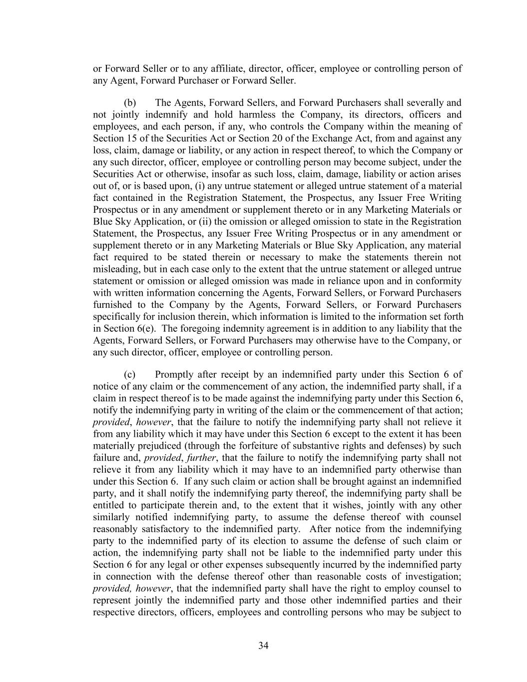 or Forward Seller or to any affiliate, director, officer, employee or controlling person of any Agent, Forward Purchaser or Forward Seller. (b) The Agents, Forward Sellers, and Forward Purchasers shall severally and not jointly indemnify and hold harmless the Company, its directors, officers and employees, and each person, if any, who controls the Company within the meaning of Section 15 of the Securities Act or Section 20 of the Exchange Act, from and against any loss, claim, damage or liability, or any action in respect thereof, to which the Company or any such director, officer, employee or controlling person may become subject, under the Securities Act or otherwise, insofar as such loss, claim, damage, liability or action arises out of, or is based upon, (i) any untrue statement or alleged untrue statement of a material fact contained in the Registration Statement, the Prospectus, any Issuer Free Writing Prospectus or in any amendment or supplement thereto or in any Marketing Materials or Blue Sky Application, or (ii) the omission or alleged omission to state in the Registration Statement, the Prospectus, any Issuer Free Writing Prospectus or in any amendment or supplement thereto or in any Marketing Materials or Blue Sky Application, any material fact required to be stated therein or necessary to make the statements therein not misleading, but in each case only to the extent that the untrue statement or alleged untrue statement or omission or alleged omission was made in reliance upon and in conformity with written information concerning the Agents, Forward Sellers, or Forward Purchasers furnished to the Company by the Agents, Forward Sellers, or Forward Purchasers specifically for inclusion therein, which information is limited to the information set forth in Section 6(e). The foregoing indemnity agreement is in addition to any liability that the Agents, Forward Sellers, or Forward Purchasers may otherwise have to the Company, or any such director, officer, employee or controlling person. (c) Promptly after receipt by an indemnified party under this Section 6 of notice of any claim or the commencement of any action, the indemnified party shall, if a claim in respect thereof is to be made against the indemnifying party under this Section 6, notify the indemnifying party in writing of the claim or the commencement of that action; provided, however, that the failure to notify the indemnifying party shall not relieve it from any liability which it may have under this Section 6 except to the extent it has been materially prejudiced (through the forfeiture of substantive rights and defenses) by such failure and, provided, further, that the failure to notify the indemnifying party shall not relieve it from any liability which it may have to an indemnified party otherwise than under this Section 6. If any such claim or action shall be brought against an indemnified party, and it shall notify the indemnifying party thereof, the indemnifying party shall be entitled to participate therein and, to the extent that it wishes, jointly with any other similarly notified indemnifying party, to assume the defense thereof with counsel reasonably satisfactory to the indemnified party. After notice from the indemnifying party to the indemnified party of its election to assume the defense of such claim or action, the indemnifying party shall not be liable to the indemnified party under this Section 6 for any legal or other expenses subsequently incurred by the indemnified party in connection with the defense thereof other than reasonable costs of investigation; provided, however, that the indemnified party shall have the right to employ counsel to represent jointly the indemnified party and those other indemnified parties and their respective directors, officers, employees and controlling persons who may be subject to 34