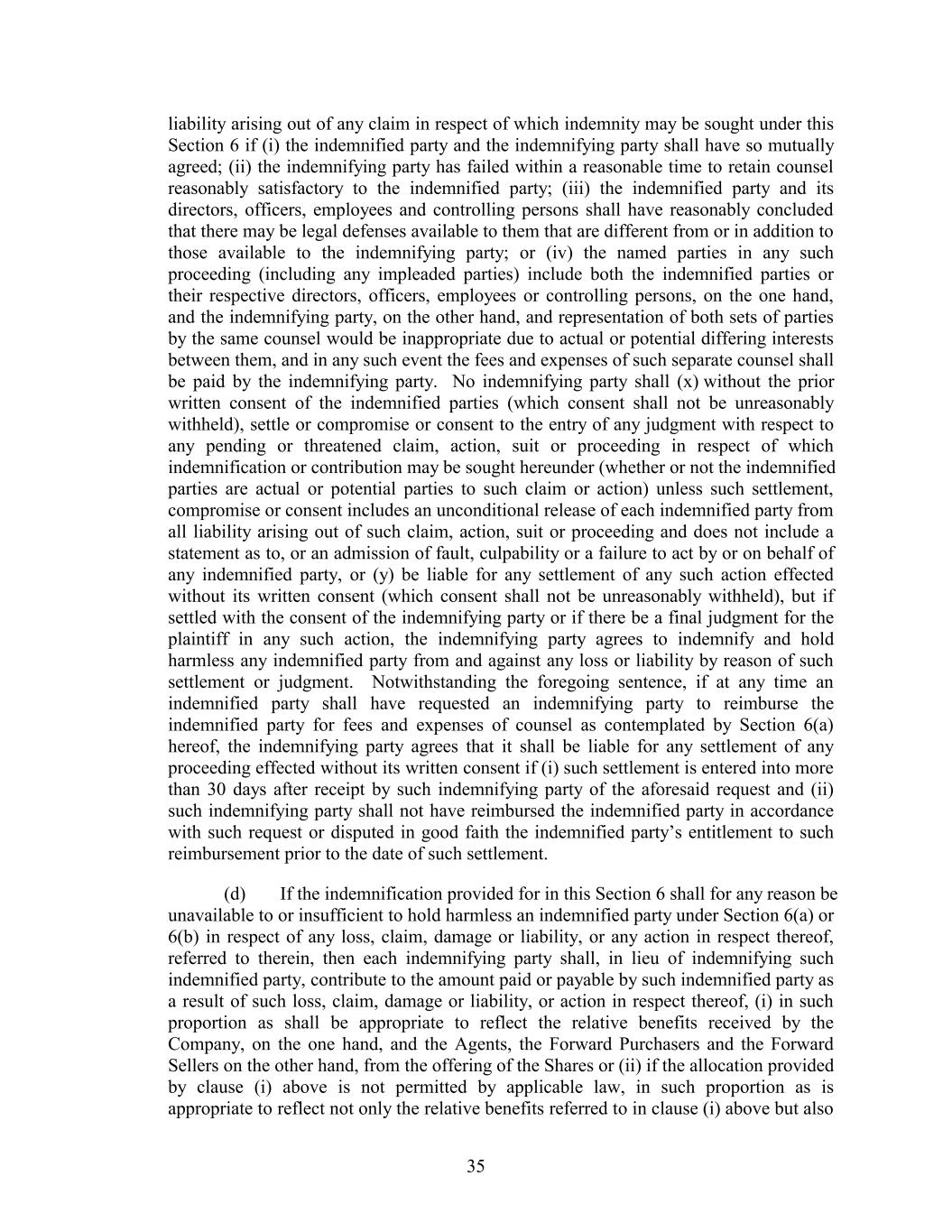 liability arising out of any claim in respect of which indemnity may be sought under this Section 6 if (i) the indemnified party and the indemnifying party shall have so mutually agreed; (ii) the indemnifying party has failed within a reasonable time to retain counsel reasonably satisfactory to the indemnified party; (iii) the indemnified party and its directors, officers, employees and controlling persons shall have reasonably concluded that there may be legal defenses available to them that are different from or in addition to those available to the indemnifying party; or (iv) the named parties in any such proceeding (including any impleaded parties) include both the indemnified parties or their respective directors, officers, employees or controlling persons, on the one hand, and the indemnifying party, on the other hand, and representation of both sets of parties by the same counsel would be inappropriate due to actual or potential differing interests between them, and in any such event the fees and expenses of such separate counsel shall be paid by the indemnifying party. No indemnifying party shall (x) without the prior written consent of the indemnified parties (which consent shall not be unreasonably withheld), settle or compromise or consent to the entry of any judgment with respect to any pending or threatened claim, action, suit or proceeding in respect of which indemnification or contribution may be sought hereunder (whether or not the indemnified parties are actual or potential parties to such claim or action) unless such settlement, compromise or consent includes an unconditional release of each indemnified party from all liability arising out of such claim, action, suit or proceeding and does not include a statement as to, or an admission of fault, culpability or a failure to act by or on behalf of any indemnified party, or (y) be liable for any settlement of any such action effected without its written consent (which consent shall not be unreasonably withheld), but if settled with the consent of the indemnifying party or if there be a final judgment for the plaintiff in any such action, the indemnifying party agrees to indemnify and hold harmless any indemnified party from and against any loss or liability by reason of such settlement or judgment. Notwithstanding the foregoing sentence, if at any time an indemnified party shall have requested an indemnifying party to reimburse the indemnified party for fees and expenses of counsel as contemplated by Section 6(a) hereof, the indemnifying party agrees that it shall be liable for any settlement of any proceeding effected without its written consent if (i) such settlement is entered into more than 30 days after receipt by such indemnifying party of the aforesaid request and (ii) such indemnifying party shall not have reimbursed the indemnified party in accordance with such request or disputed in good faith the indemnified party’s entitlement to such reimbursement prior to the date of such settlement. (d) If the indemnification provided for in this Section 6 shall for any reason be unavailable to or insufficient to hold harmless an indemnified party under Section 6(a) or 6(b) in respect of any loss, claim, damage or liability, or any action in respect thereof, referred to therein, then each indemnifying party shall, in lieu of indemnifying such indemnified party, contribute to the amount paid or payable by such indemnified party as a result of such loss, claim, damage or liability, or action in respect thereof, (i) in such proportion as shall be appropriate to reflect the relative benefits received by the Company, on the one hand, and the Agents, the Forward Purchasers and the Forward Sellers on the other hand, from the offering of the Shares or (ii) if the allocation provided by clause (i) above is not permitted by applicable law, in such proportion as is appropriate to reflect not only the relative benefits referred to in clause (i) above but also 35