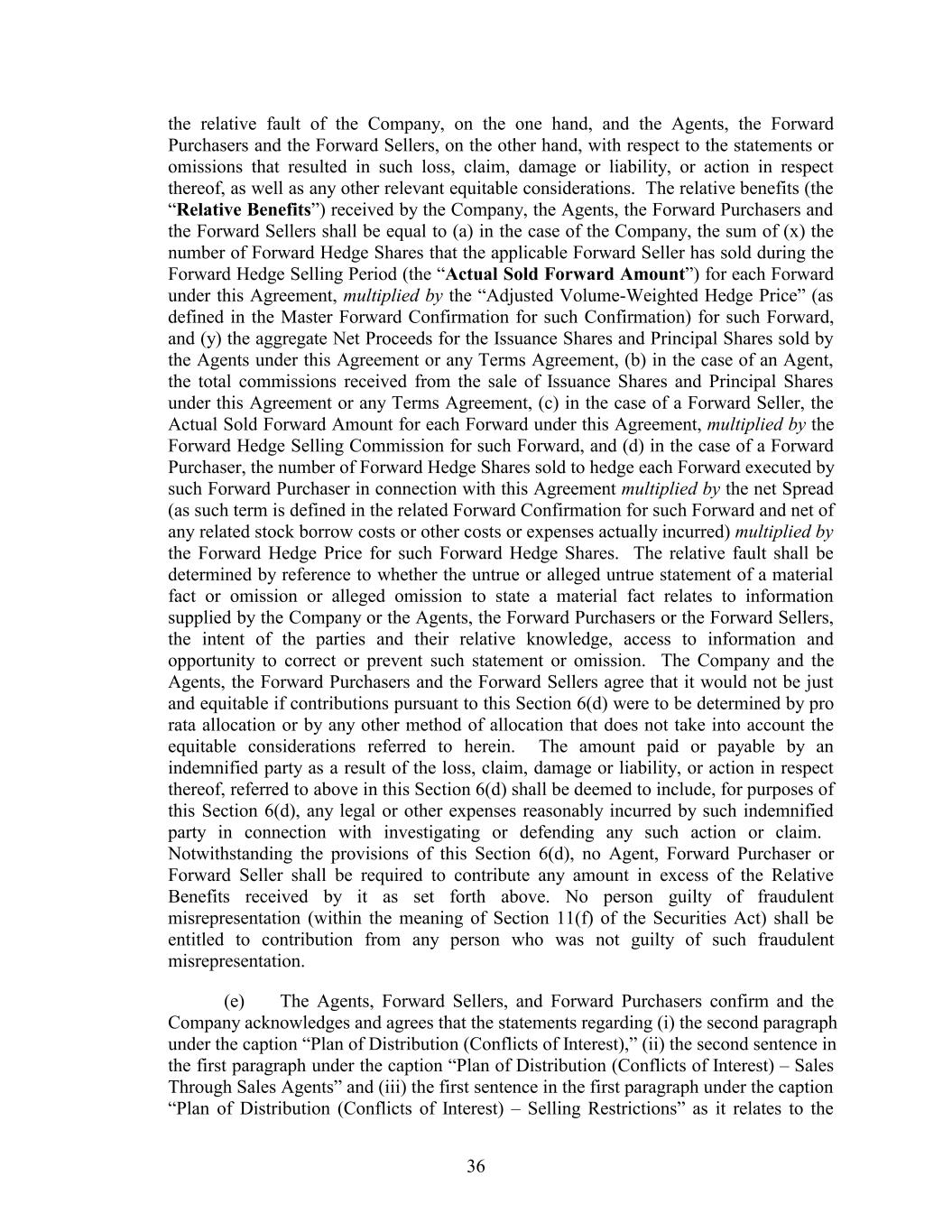 the relative fault of the Company, on the one hand, and the Agents, the Forward Purchasers and the Forward Sellers, on the other hand, with respect to the statements or omissions that resulted in such loss, claim, damage or liability, or action in respect thereof, as well as any other relevant equitable considerations. The relative benefits (the “Relative Benefits”) received by the Company, the Agents, the Forward Purchasers and the Forward Sellers shall be equal to (a) in the case of the Company, the sum of (x) the number of Forward Hedge Shares that the applicable Forward Seller has sold during the Forward Hedge Selling Period (the “Actual Sold Forward Amount”) for each Forward under this Agreement, multiplied by the “Adjusted Volume-Weighted Hedge Price” (as defined in the Master Forward Confirmation for such Confirmation) for such Forward, and (y) the aggregate Net Proceeds for the Issuance Shares and Principal Shares sold by the Agents under this Agreement or any Terms Agreement, (b) in the case of an Agent, the total commissions received from the sale of Issuance Shares and Principal Shares under this Agreement or any Terms Agreement, (c) in the case of a Forward Seller, the Actual Sold Forward Amount for each Forward under this Agreement, multiplied by the Forward Hedge Selling Commission for such Forward, and (d) in the case of a Forward Purchaser, the number of Forward Hedge Shares sold to hedge each Forward executed by such Forward Purchaser in connection with this Agreement multiplied by the net Spread (as such term is defined in the related Forward Confirmation for such Forward and net of any related stock borrow costs or other costs or expenses actually incurred) multiplied by the Forward Hedge Price for such Forward Hedge Shares. The relative fault shall be determined by reference to whether the untrue or alleged untrue statement of a material fact or omission or alleged omission to state a material fact relates to information supplied by the Company or the Agents, the Forward Purchasers or the Forward Sellers, the intent of the parties and their relative knowledge, access to information and opportunity to correct or prevent such statement or omission. The Company and the Agents, the Forward Purchasers and the Forward Sellers agree that it would not be just and equitable if contributions pursuant to this Section 6(d) were to be determined by pro rata allocation or by any other method of allocation that does not take into account the equitable considerations referred to herein. The amount paid or payable by an indemnified party as a result of the loss, claim, damage or liability, or action in respect thereof, referred to above in this Section 6(d) shall be deemed to include, for purposes of this Section 6(d), any legal or other expenses reasonably incurred by such indemnified party in connection with investigating or defending any such action or claim. Notwithstanding the provisions of this Section 6(d), no Agent, Forward Purchaser or Forward Seller shall be required to contribute any amount in excess of the Relative Benefits received by it as set forth above. No person guilty of fraudulent misrepresentation (within the meaning of Section 11(f) of the Securities Act) shall be entitled to contribution from any person who was not guilty of such fraudulent misrepresentation. (e) The Agents, Forward Sellers, and Forward Purchasers confirm and the Company acknowledges and agrees that the statements regarding (i) the second paragraph under the caption “Plan of Distribution (Conflicts of Interest),” (ii) the second sentence in the first paragraph under the caption “Plan of Distribution (Conflicts of Interest) – Sales Through Sales Agents” and (iii) the first sentence in the first paragraph under the caption “Plan of Distribution (Conflicts of Interest) – Selling Restrictions” as it relates to the 36