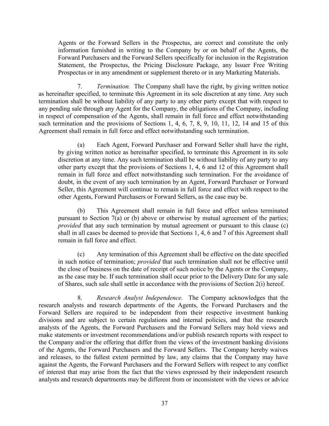 Agents or the Forward Sellers in the Prospectus, are correct and constitute the only information furnished in writing to the Company by or on behalf of the Agents, the Forward Purchasers and the Forward Sellers specifically for inclusion in the Registration Statement, the Prospectus, the Pricing Disclosure Package, any Issuer Free Writing Prospectus or in any amendment or supplement thereto or in any Marketing Materials. 7. Termination. The Company shall have the right, by giving written notice as hereinafter specified, to terminate this Agreement in its sole discretion at any time. Any such termination shall be without liability of any party to any other party except that with respect to any pending sale through any Agent for the Company, the obligations of the Company, including in respect of compensation of the Agents, shall remain in full force and effect notwithstanding such termination and the provisions of Sections 1, 4, 6, 7, 8, 9, 10, 11, 12, 14 and 15 of this Agreement shall remain in full force and effect notwithstanding such termination. (a) Each Agent, Forward Purchaser and Forward Seller shall have the right, by giving written notice as hereinafter specified, to terminate this Agreement in its sole discretion at any time. Any such termination shall be without liability of any party to any other party except that the provisions of Sections 1, 4, 6 and 12 of this Agreement shall remain in full force and effect notwithstanding such termination. For the avoidance of doubt, in the event of any such termination by an Agent, Forward Purchaser or Forward Seller, this Agreement will continue to remain in full force and effect with respect to the other Agents, Forward Purchasers or Forward Sellers, as the case may be. (b) This Agreement shall remain in full force and effect unless terminated pursuant to Section 7(a) or (b) above or otherwise by mutual agreement of the parties; provided that any such termination by mutual agreement or pursuant to this clause (c) shall in all cases be deemed to provide that Sections 1, 4, 6 and 7 of this Agreement shall remain in full force and effect. (c) Any termination of this Agreement shall be effective on the date specified in such notice of termination; provided that such termination shall not be effective until the close of business on the date of receipt of such notice by the Agents or the Company, as the case may be. If such termination shall occur prior to the Delivery Date for any sale of Shares, such sale shall settle in accordance with the provisions of Section 2(i) hereof. 8. Research Analyst Independence. The Company acknowledges that the research analysts and research departments of the Agents, the Forward Purchasers and the Forward Sellers are required to be independent from their respective investment banking divisions and are subject to certain regulations and internal policies, and that the research analysts of the Agents, the Forward Purchasers and the Forward Sellers may hold views and make statements or investment recommendations and/or publish research reports with respect to the Company and/or the offering that differ from the views of the investment banking divisions of the Agents, the Forward Purchasers and the Forward Sellers. The Company hereby waives and releases, to the fullest extent permitted by law, any claims that the Company may have against the Agents, the Forward Purchasers and the Forward Sellers with respect to any conflict of interest that may arise from the fact that the views expressed by their independent research analysts and research departments may be different from or inconsistent with the views or advice 37