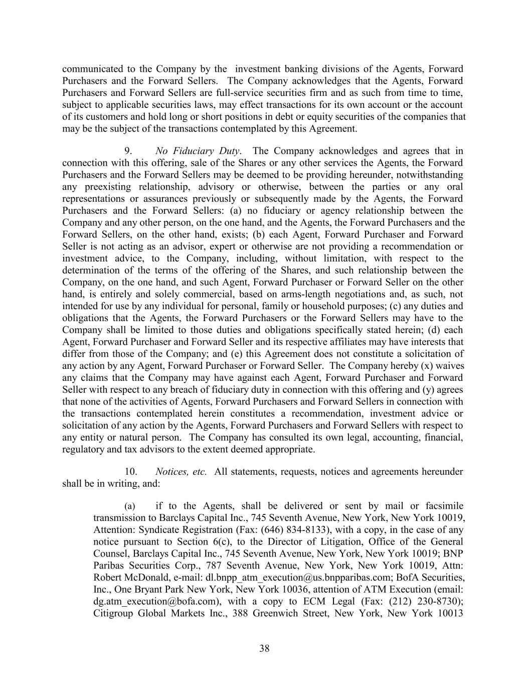 communicated to the Company by the investment banking divisions of the Agents, Forward Purchasers and the Forward Sellers. The Company acknowledges that the Agents, Forward Purchasers and Forward Sellers are full-service securities firm and as such from time to time, subject to applicable securities laws, may effect transactions for its own account or the account of its customers and hold long or short positions in debt or equity securities of the companies that may be the subject of the transactions contemplated by this Agreement. 9. No Fiduciary Duty. The Company acknowledges and agrees that in connection with this offering, sale of the Shares or any other services the Agents, the Forward Purchasers and the Forward Sellers may be deemed to be providing hereunder, notwithstanding any preexisting relationship, advisory or otherwise, between the parties or any oral representations or assurances previously or subsequently made by the Agents, the Forward Purchasers and the Forward Sellers: (a) no fiduciary or agency relationship between the Company and any other person, on the one hand, and the Agents, the Forward Purchasers and the Forward Sellers, on the other hand, exists; (b) each Agent, Forward Purchaser and Forward Seller is not acting as an advisor, expert or otherwise are not providing a recommendation or investment advice, to the Company, including, without limitation, with respect to the determination of the terms of the offering of the Shares, and such relationship between the Company, on the one hand, and such Agent, Forward Purchaser or Forward Seller on the other hand, is entirely and solely commercial, based on arms-length negotiations and, as such, not intended for use by any individual for personal, family or household purposes; (c) any duties and obligations that the Agents, the Forward Purchasers or the Forward Sellers may have to the Company shall be limited to those duties and obligations specifically stated herein; (d) each Agent, Forward Purchaser and Forward Seller and its respective affiliates may have interests that differ from those of the Company; and (e) this Agreement does not constitute a solicitation of any action by any Agent, Forward Purchaser or Forward Seller. The Company hereby (x) waives any claims that the Company may have against each Agent, Forward Purchaser and Forward Seller with respect to any breach of fiduciary duty in connection with this offering and (y) agrees that none of the activities of Agents, Forward Purchasers and Forward Sellers in connection with the transactions contemplated herein constitutes a recommendation, investment advice or solicitation of any action by the Agents, Forward Purchasers and Forward Sellers with respect to any entity or natural person. The Company has consulted its own legal, accounting, financial, regulatory and tax advisors to the extent deemed appropriate. 10. Notices, etc. All statements, requests, notices and agreements hereunder shall be in writing, and: (a) if to the Agents, shall be delivered or sent by mail or facsimile transmission to Barclays Capital Inc., 745 Seventh Avenue, New York, New York 10019, Attention: Syndicate Registration (Fax: (646) 834-8133), with a copy, in the case of any notice pursuant to Section 6(c), to the Director of Litigation, Office of the General Counsel, Barclays Capital Inc., 745 Seventh Avenue, New York, New York 10019; BNP Paribas Securities Corp., 787 Seventh Avenue, New York, New York 10019, Attn: Robert McDonald, e-mail: dl.bnpp_atm_execution@us.bnpparibas.com; BofA Securities, Inc., One Bryant Park New York, New York 10036, attention of ATM Execution (email: dg.atm_execution@bofa.com), with a copy to ECM Legal (Fax: (212) 230-8730); Citigroup Global Markets Inc., 388 Greenwich Street, New York, New York 10013 38
