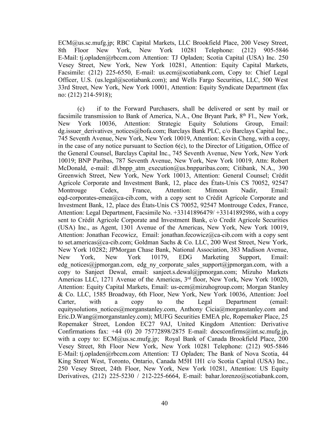 ECM@us.sc.mufg.jp; RBC Capital Markets, LLC Brookfield Place, 200 Vesey Street, 8th Floor New York, New York 10281 Telephone: (212) 905-5846 E-Mail: tj.opladen@rbccm.com Attention: TJ Opladen; Scotia Capital (USA) Inc. 250 Vesey Street, New York, New York 10281, Attention: Equity Capital Markets, Facsimile: (212) 225-6550, E-mail: us.ecm@scotiabank.com, Copy to: Chief Legal Officer, U.S. (us.legal@scotiabank.com); and Wells Fargo Securities, LLC, 500 West 33rd Street, New York, New York 10001, Attention: Equity Syndicate Department (fax no: (212) 214-5918); (c) if to the Forward Purchasers, shall be delivered or sent by mail or facsimile transmission to Bank of America, N.A., One Bryant Park, 8th Fl., New York, New York 10036, Attention: Strategic Equity Solutions Group, Email: dg.issuer_derivatives_notices@bofa.com; Barclays Bank PLC, c/o Barclays Capital Inc., 745 Seventh Avenue, New York, New York 10019, Attention: Kevin Cheng, with a copy, in the case of any notice pursuant to Section 6(c), to the Director of Litigation, Office of the General Counsel, Barclays Capital Inc., 745 Seventh Avenue, New York, New York 10019; BNP Paribas, 787 Seventh Avenue, New York, New York 10019, Attn: Robert McDonald, e-mail: dl.bnpp_atm_execution@us.bnpparibas.com; Citibank, N.A., 390 Greenwich Street, New York, New York 10013, Attention: General Counsel; Crédit Agricole Corporate and Investment Bank, 12, place des États-Unis CS 70052, 92547 Montrouge Cedex, France, Attention: Mimoun Nadir, Email: eqd-corporates-emea@ca-cib.com, with a copy sent to Crédit Agricole Corporate and Investment Bank, 12, place des États-Unis CS 70052, 92547 Montrouge Cedex, France, Attention: Legal Department, Facsimile No. +33141896479/ +33141892986, with a copy sent to Crédit Agricole Corporate and Investment Bank, c/o Credit Agricole Securities (USA) Inc., as Agent, 1301 Avenue of the Americas, New York, New York 10019, Attention: Jonathan Fecowicz, Email: jonathan.fecowicz@ca-cib.com with a copy sent to set.americas@ca-cib.com; Goldman Sachs & Co. LLC, 200 West Street, New York, New York 10282; JPMorgan Chase Bank, National Association, 383 Madison Avenue, New York, New York 10179, EDG Marketing Support, Email: edg_notices@jpmorgan.com, edg_ny_corporate_sales_support@jpmorgan.com, with a copy to Sanjeet Dewal, email: sanjeet.s.dewal@jpmorgan.com; Mizuho Markets Americas LLC, 1271 Avenue of the Americas, 3rd floor, New York, New York 10020, Attention: Equity Capital Markets, Email: us-ecm@mizuhogroup.com; Morgan Stanley & Co. LLC, 1585 Broadway, 6th Floor, New York, New York 10036, Attention: Joel Carter, with a copy to the Legal Department (email: equitysolutions_notices@morganstanley.com, Anthony Cicia@morganstanley.com and Eric.D.Wang@morganstanley.com); MUFG Securities EMEA plc, Ropemaker Place, 25 Ropemaker Street, London EC27 9AJ, United Kingdom Attention: Derivative Confirmations fax: +44 (0) 20 75772898/2875 E-mail: docsconfirms@int.sc.mufg.jp, with a copy to: ECM@us.sc.mufg.jp; Royal Bank of Canada Brookfield Place, 200 Vesey Street, 8th Floor New York, New York 10281 Telephone: (212) 905-5846 E-Mail: tj.opladen@rbccm.com Attention: TJ Opladen; The Bank of Nova Scotia, 44 King Street West, Toronto, Ontario, Canada M5H 1H1 c/o Scotia Capital (USA) Inc., 250 Vesey Street, 24th Floor, New York, New York 10281, Attention: US Equity Derivatives, (212) 225-5230 / 212-225-6664, E-mail: bahar.lorenzo@scotiabank.com, 40