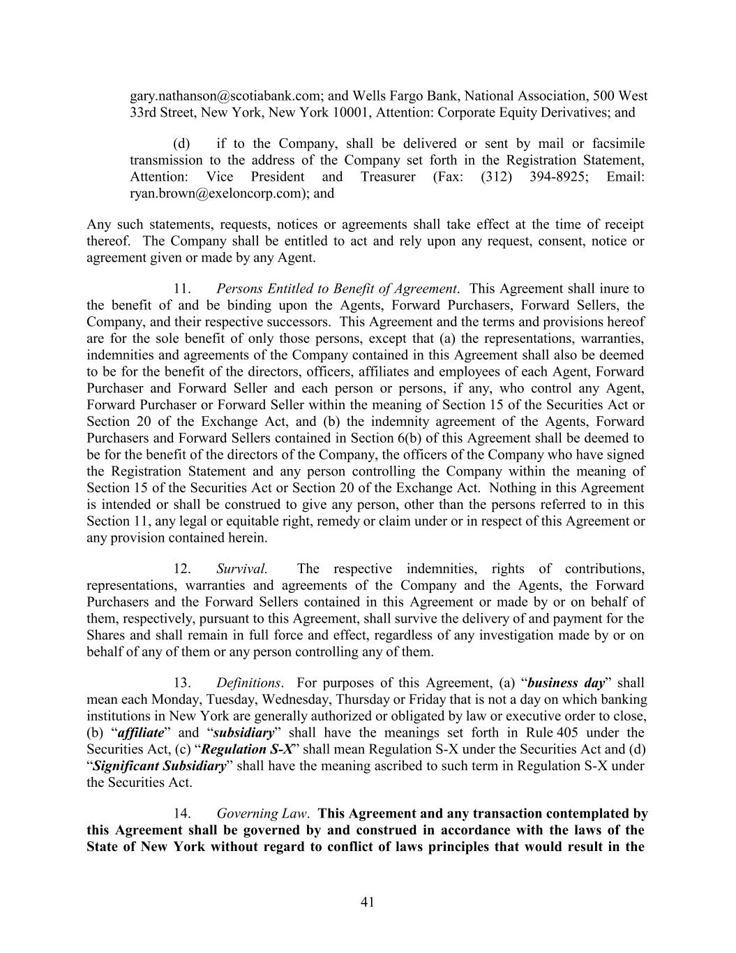 gary.nathanson@scotiabank.com; and Wells Fargo Bank, National Association, 500 West 33rd Street, New York, New York 10001, Attention: Corporate Equity Derivatives; and (d) if to the Company, shall be delivered or sent by mail or facsimile transmission to the address of the Company set forth in the Registration Statement, Attention: Vice President and Treasurer (Fax: (312) 394-8925; Email: ryan.brown@exeloncorp.com); and Any such statements, requests, notices or agreements shall take effect at the time of receipt thereof. The Company shall be entitled to act and rely upon any request, consent, notice or agreement given or made by any Agent. 11. Persons Entitled to Benefit of Agreement. This Agreement shall inure to the benefit of and be binding upon the Agents, Forward Purchasers, Forward Sellers, the Company, and their respective successors. This Agreement and the terms and provisions hereof are for the sole benefit of only those persons, except that (a) the representations, warranties, indemnities and agreements of the Company contained in this Agreement shall also be deemed to be for the benefit of the directors, officers, affiliates and employees of each Agent, Forward Purchaser and Forward Seller and each person or persons, if any, who control any Agent, Forward Purchaser or Forward Seller within the meaning of Section 15 of the Securities Act or Section 20 of the Exchange Act, and (b) the indemnity agreement of the Agents, Forward Purchasers and Forward Sellers contained in Section 6(b) of this Agreement shall be deemed to be for the benefit of the directors of the Company, the officers of the Company who have signed the Registration Statement and any person controlling the Company within the meaning of Section 15 of the Securities Act or Section 20 of the Exchange Act. Nothing in this Agreement is intended or shall be construed to give any person, other than the persons referred to in this Section 11, any legal or equitable right, remedy or claim under or in respect of this Agreement or any provision contained herein. 12. Survival. The respective indemnities, rights of contributions, representations, warranties and agreements of the Company and the Agents, the Forward Purchasers and the Forward Sellers contained in this Agreement or made by or on behalf of them, respectively, pursuant to this Agreement, shall survive the delivery of and payment for the Shares and shall remain in full force and effect, regardless of any investigation made by or on behalf of any of them or any person controlling any of them. 13. Definitions. For purposes of this Agreement, (a) “business day” shall mean each Monday, Tuesday, Wednesday, Thursday or Friday that is not a day on which banking institutions in New York are generally authorized or obligated by law or executive order to close, (b) “affiliate” and “subsidiary” shall have the meanings set forth in Rule 405 under the Securities Act, (c) “Regulation S-X” shall mean Regulation S-X under the Securities Act and (d) “Significant Subsidiary” shall have the meaning ascribed to such term in Regulation S-X under the Securities Act. 14. Governing Law. This Agreement and any transaction contemplated by this Agreement shall be governed by and construed in accordance with the laws of the State of New York without regard to conflict of laws principles that would result in the 41