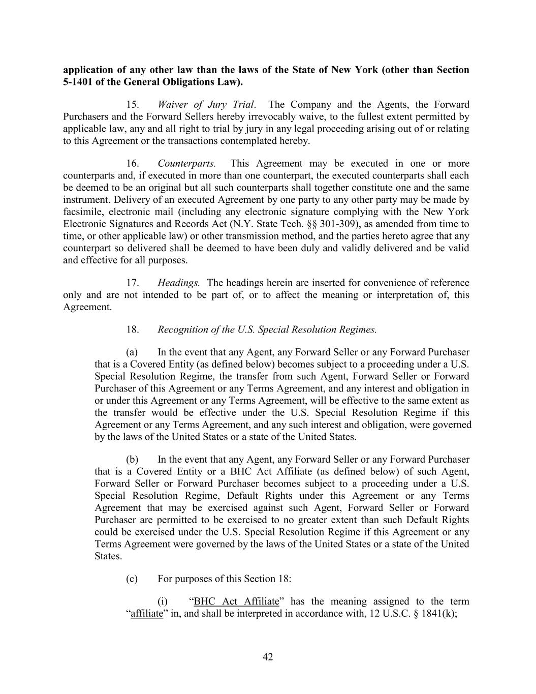 application of any other law than the laws of the State of New York (other than Section 5-1401 of the General Obligations Law). 15. Waiver of Jury Trial. The Company and the Agents, the Forward Purchasers and the Forward Sellers hereby irrevocably waive, to the fullest extent permitted by applicable law, any and all right to trial by jury in any legal proceeding arising out of or relating to this Agreement or the transactions contemplated hereby. 16. Counterparts. This Agreement may be executed in one or more counterparts and, if executed in more than one counterpart, the executed counterparts shall each be deemed to be an original but all such counterparts shall together constitute one and the same instrument. Delivery of an executed Agreement by one party to any other party may be made by facsimile, electronic mail (including any electronic signature complying with the New York Electronic Signatures and Records Act (N.Y. State Tech. §§ 301-309), as amended from time to time, or other applicable law) or other transmission method, and the parties hereto agree that any counterpart so delivered shall be deemed to have been duly and validly delivered and be valid and effective for all purposes. 17. Headings. The headings herein are inserted for convenience of reference only and are not intended to be part of, or to affect the meaning or interpretation of, this Agreement. 18. Recognition of the U.S. Special Resolution Regimes. (a) In the event that any Agent, any Forward Seller or any Forward Purchaser that is a Covered Entity (as defined below) becomes subject to a proceeding under a U.S. Special Resolution Regime, the transfer from such Agent, Forward Seller or Forward Purchaser of this Agreement or any Terms Agreement, and any interest and obligation in or under this Agreement or any Terms Agreement, will be effective to the same extent as the transfer would be effective under the U.S. Special Resolution Regime if this Agreement or any Terms Agreement, and any such interest and obligation, were governed by the laws of the United States or a state of the United States. (b) In the event that any Agent, any Forward Seller or any Forward Purchaser that is a Covered Entity or a BHC Act Affiliate (as defined below) of such Agent, Forward Seller or Forward Purchaser becomes subject to a proceeding under a U.S. Special Resolution Regime, Default Rights under this Agreement or any Terms Agreement that may be exercised against such Agent, Forward Seller or Forward Purchaser are permitted to be exercised to no greater extent than such Default Rights could be exercised under the U.S. Special Resolution Regime if this Agreement or any Terms Agreement were governed by the laws of the United States or a state of the United States. (c) For purposes of this Section 18: (i) “BHC Act Affiliate” has the meaning assigned to the term “affiliate” in, and shall be interpreted in accordance with, 12 U.S.C. § 1841(k); 42