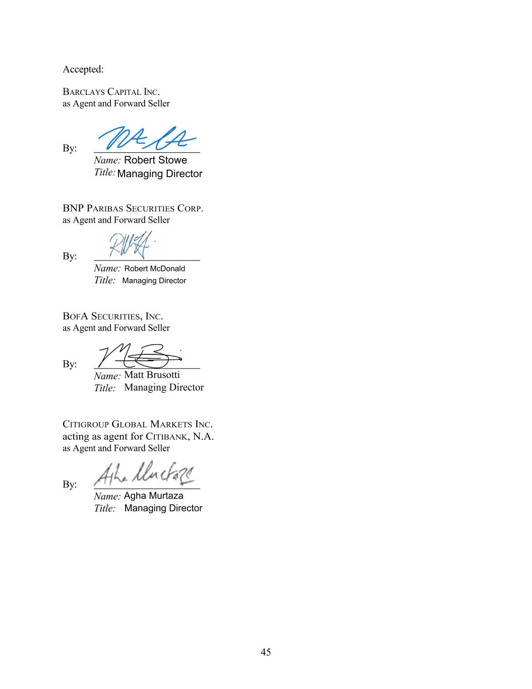 Accepted: BARCLAYS CAPITAL INC. as Agent and Forward Seller By: Name: Title: BNP PARIBAS SECURITIES CORP. as Agent and Forward Seller By: Name: Title: BOFA SECURITIES, INC. as Agent and Forward Seller By: Name: Title: CITIGROUP GLOBAL MARKETS INC. acting as agent for CITIBANK, N.A. as Agent and Forward Seller By: Name: Title: 45 Robert Stowe Managing Director Matt Brusotti Managing Director Agha Murtaza Managing Director Robert McDonald Managing Director