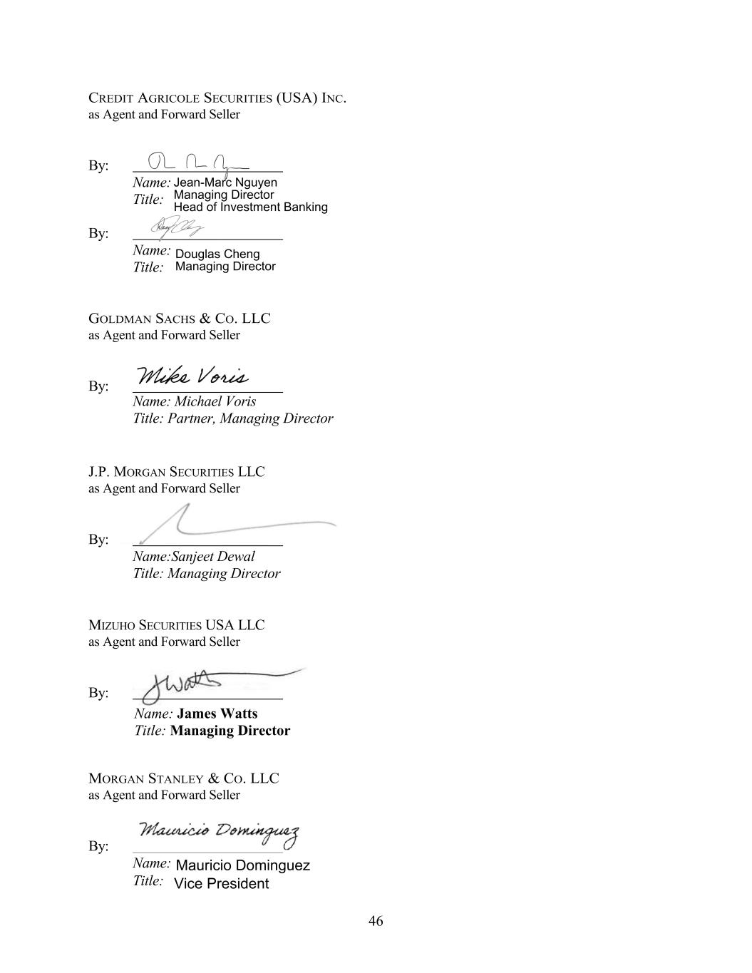 CREDIT AGRICOLE SECURITIES (USA) INC. as Agent and Forward Seller By: Name: Title: By: Name: Title: GOLDMAN SACHS & CO. LLC as Agent and Forward Seller By: J.P. MORGAN SECURITIES LLC as Agent and Forward Seller By: Name:Sanjeet Dewal Title: Managing Director MIZUHO SECURITIES USA LLC as Agent and Forward Seller By: MORGAN STANLEY & CO. LLC as Agent and Forward Seller By: Name: Title: 46 Jean-Marc Nguyen Managing Director Head of Investment Banking Douglas Cheng Managing Director Name: Michael Voris Title: Partner, Managing Director Name: James Watts Title: Managing Director Mauricio Dominguez Vice President