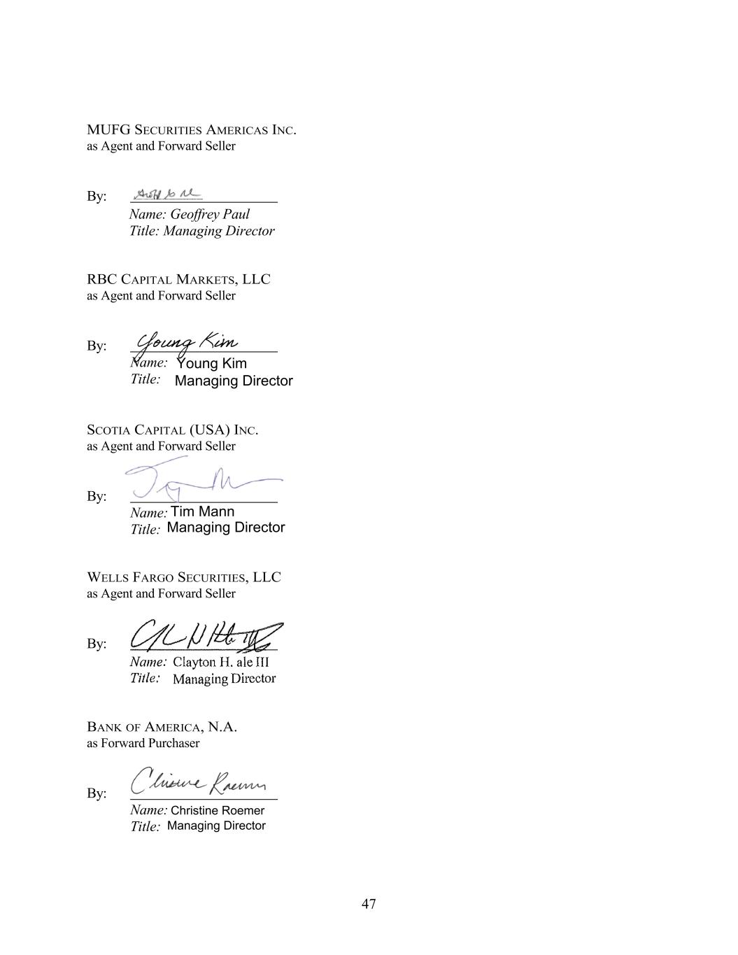MUFG SECURITIES AMERICAS INC. as Agent and Forward Seller By: RBC CAPITAL MARKETS, LLC as Agent and Forward Seller By: Name: Title: SCOTIA CAPITAL (USA) INC. as Agent and Forward Seller By: Name: Title: WELLS FARGO SECURITIES, LLC as Agent and Forward Seller By: BANK OF AMERICA, N.A. as Forward Purchaser By: Name: Title: 47 Christine Roemer Managing Director Name: Geoffrey Paul Title: Managing Director Young Kim Managing Director Tim Mann Managing Director Name: Clayton H. ale Ill Title: Managing Director