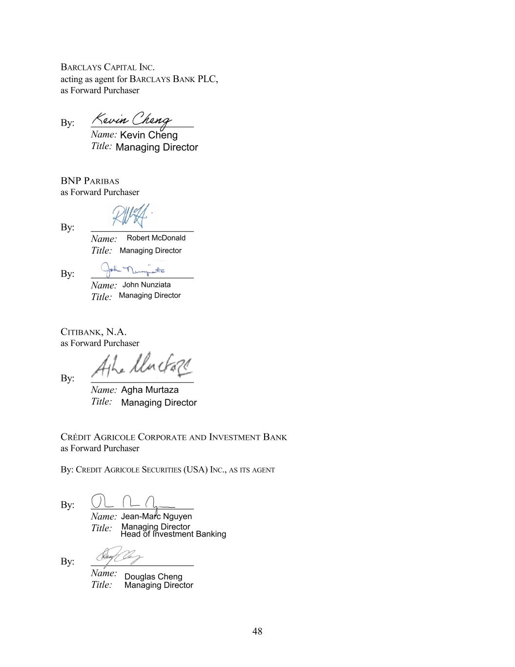 BARCLAYS CAPITAL INC. acting as agent for BARCLAYS BANK PLC, as Forward Purchaser By: Name: Title: BNP PARIBAS as Forward Purchaser By: Name: Title: By: Name: Title: CITIBANK, N.A. as Forward Purchaser By: Name: Title: CRÉDIT AGRICOLE CORPORATE AND INVESTMENT BANK as Forward Purchaser By: CREDIT AGRICOLE SECURITIES (USA) INC., AS ITS AGENT By: Name: Title: By: Name: Title: 48 Kevin Cheng Managing Director Agha Murtaza Managing Director Jean-Marc Nguyen Managing Director Head of Investment Banking Douglas Cheng Managing Director Robert McDonald Managing Director John Nunziata Managing Director
