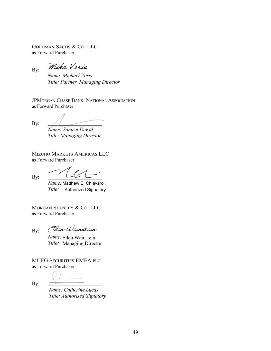 GOLDMAN SACHS & CO. LLC as Forward Purchaser By: Title: Partner, Managing Director JPMORGAN CHASE BANK, NATIONAL ASSOCIATION as Forward Purchaser By: Name: Sanjeet Dewal Title: Managing Director MIZUHO MARKETS AMERICAS LLC as Forward Purchaser By: Name: Title: MORGAN STANLEY & CO. LLC as Forward Purchaser By: Name: Title: MUFG SECURITIES EMEA PLC as Forward Purchaser By: 49 Name: Michael Voris Matthew E. Chiavaroli Authorized Signatory Ellen Weinstein Managing Director Name: Catherine Lucas Title: Authorised Signatory
