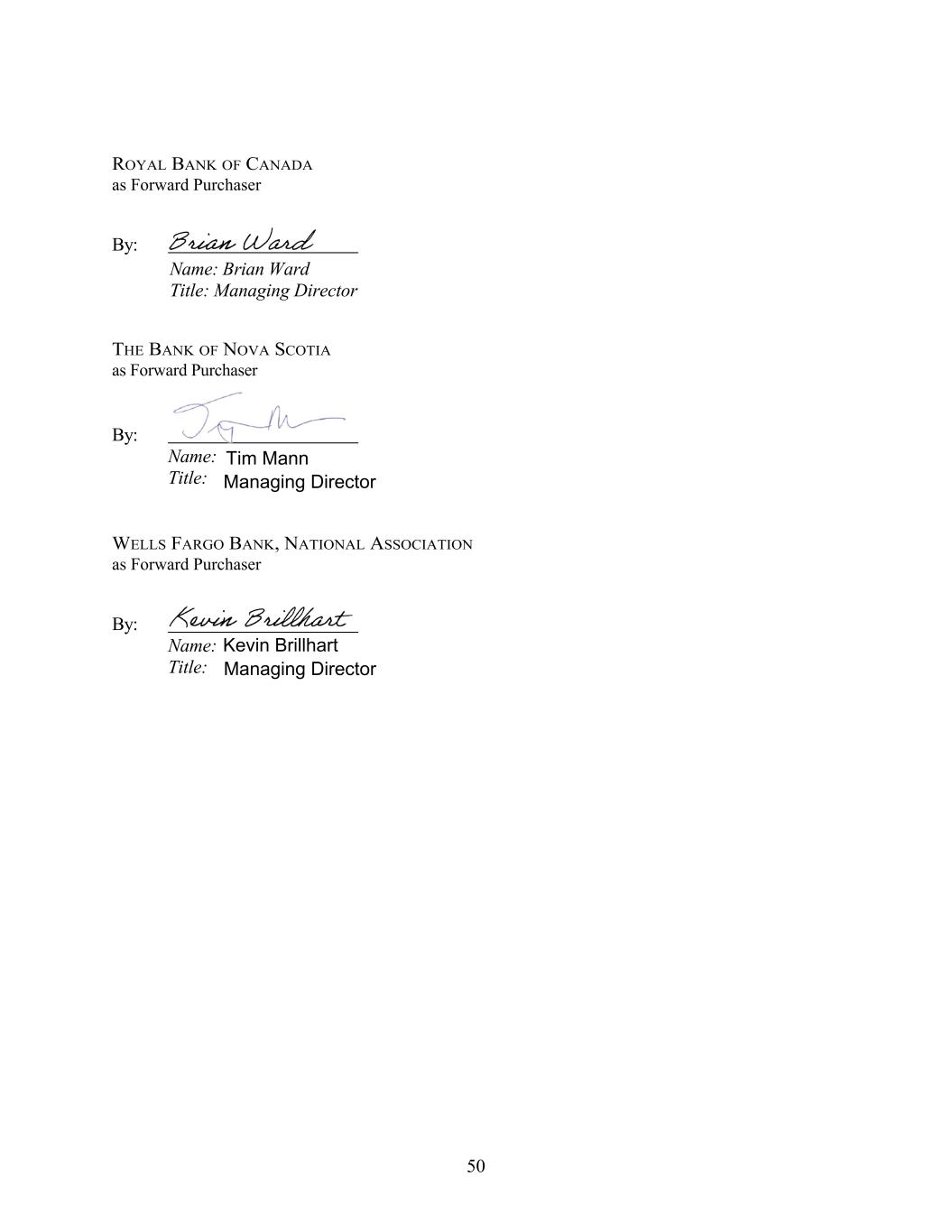 ROYAL BANK OF CANADA as Forward Purchaser By: THE BANK OF NOVA SCOTIA as Forward Purchaser By: Name: Title: WELLS FARGO BANK, NATIONAL ASSOCIATION as Forward Purchaser By: Name: Title: 50 Name: Brian Ward Title: Managing Director Tim Mann Managing Director Kevin Brillhart Managing Director