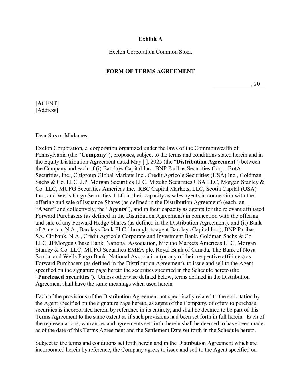 Exhibit A Exelon Corporation Common Stock FORM OF TERMS AGREEMENT _____________, 20__ [AGENT] [Address] Dear Sirs or Madames: Exelon Corporation, a corporation organized under the laws of the Commonwealth of Pennsylvania (the “Company”), proposes, subject to the terms and conditions stated herein and in the Equity Distribution Agreement dated May [ ], 2025 (the “Distribution Agreement”) between the Company and each of (i) Barclays Capital Inc., BNP Paribas Securities Corp., BofA Securities, Inc., Citigroup Global Markets Inc., Credit Agricole Securities (USA) Inc., Goldman Sachs & Co. LLC, J.P. Morgan Securities LLC, Mizuho Securities USA LLC, Morgan Stanley & Co. LLC, MUFG Securities Americas Inc., RBC Capital Markets, LLC, Scotia Capital (USA) Inc., and Wells Fargo Securities, LLC in their capacity as sales agents in connection with the offering and sale of Issuance Shares (as defined in the Distribution Agreement) (each, an “Agent” and collectively, the “Agents”), and in their capacity as agents for the relevant affiliated Forward Purchasers (as defined in the Distribution Agreement) in connection with the offering and sale of any Forward Hedge Shares (as defined in the Distribution Agreement), and (ii) Bank of America, N.A., Barclays Bank PLC (through its agent Barclays Capital Inc.), BNP Paribas SA, Citibank, N.A., Crédit Agricole Corporate and Investment Bank, Goldman Sachs & Co. LLC, JPMorgan Chase Bank, National Association, Mizuho Markets Americas LLC, Morgan Stanley & Co. LLC, MUFG Securities EMEA plc, Royal Bank of Canada, The Bank of Nova Scotia, and Wells Fargo Bank, National Association (or any of their respective affiliates) as Forward Purchasers (as defined in the Distribution Agreement), to issue and sell to the Agent specified on the signature page hereto the securities specified in the Schedule hereto (the “Purchased Securities”). Unless otherwise defined below, terms defined in the Distribution Agreement shall have the same meanings when used herein. Each of the provisions of the Distribution Agreement not specifically related to the solicitation by the Agent specified on the signature page hereto, as agent of the Company, of offers to purchase securities is incorporated herein by reference in its entirety, and shall be deemed to be part of this Terms Agreement to the same extent as if such provisions had been set forth in full herein. Each of the representations, warranties and agreements set forth therein shall be deemed to have been made as of the date of this Terms Agreement and the Settlement Date set forth in the Schedule hereto. Subject to the terms and conditions set forth herein and in the Distribution Agreement which are incorporated herein by reference, the Company agrees to issue and sell to the Agent specified on