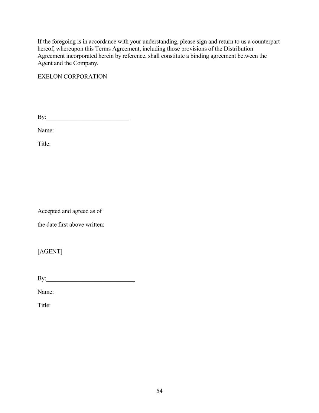If the foregoing is in accordance with your understanding, please sign and return to us a counterpart hereof, whereupon this Terms Agreement, including those provisions of the Distribution Agreement incorporated herein by reference, shall constitute a binding agreement between the Agent and the Company. EXELON CORPORATION By:___________________________ Name: Title: Accepted and agreed as of the date first above written: [AGENT] By:_____________________________ Name: Title: 54
