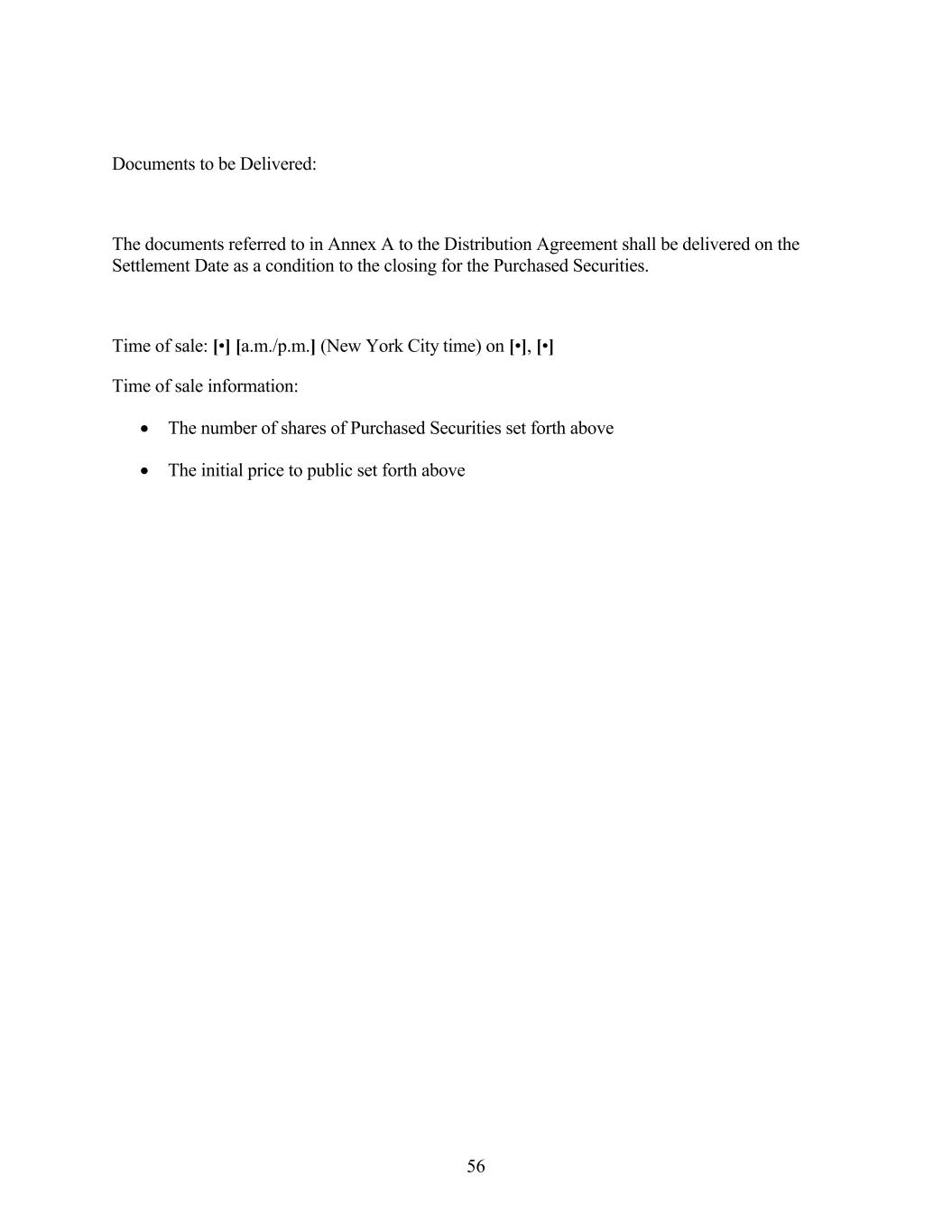Documents to be Delivered: The documents referred to in Annex A to the Distribution Agreement shall be delivered on the Settlement Date as a condition to the closing for the Purchased Securities. Time of sale: [•] [a.m./p.m.] (New York City time) on [•], [•] Time of sale information: The number of shares of Purchased Securities set forth above The initial price to public set forth above 56