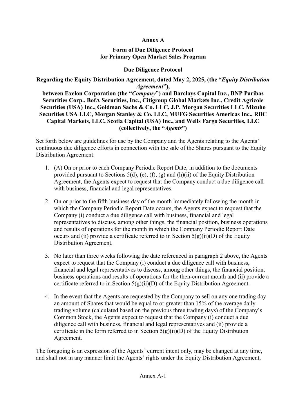 Annex A Form of Due Diligence Protocol for Primary Open Market Sales Program Due Diligence Protocol Regarding the Equity Distribution Agreement, dated May 2, 2025, (the “Equity Distribution Agreement”), between Exelon Corporation (the “Company”) and Barclays Capital Inc., BNP Paribas Securities Corp., BofA Securities, Inc., Citigroup Global Markets Inc., Credit Agricole Securities (USA) Inc., Goldman Sachs & Co. LLC, J.P. Morgan Securities LLC, Mizuho Securities USA LLC, Morgan Stanley & Co. LLC, MUFG Securities Americas Inc., RBC Capital Markets, LLC, Scotia Capital (USA) Inc., and Wells Fargo Securities, LLC (collectively, the “Agents”) Set forth below are guidelines for use by the Company and the Agents relating to the Agents’ continuous due diligence efforts in connection with the sale of the Shares pursuant to the Equity Distribution Agreement: 1. (A) On or prior to each Company Periodic Report Date, in addition to the documents provided pursuant to Sections 5(d), (e), (f), (g) and (h)(ii) of the Equity Distribution Agreement, the Agents expect to request that the Company conduct a due diligence call with business, financial and legal representatives. 2. On or prior to the fifth business day of the month immediately following the month in which the Company Periodic Report Date occurs, the Agents expect to request that the Company (i) conduct a due diligence call with business, financial and legal representatives to discuss, among other things, the financial position, business operations and results of operations for the month in which the Company Periodic Report Date occurs and (ii) provide a certificate referred to in Section 5(g)(ii)(D) of the Equity Distribution Agreement. 3. No later than three weeks following the date referenced in paragraph 2 above, the Agents expect to request that the Company (i) conduct a due diligence call with business, financial and legal representatives to discuss, among other things, the financial position, business operations and results of operations for the then-current month and (ii) provide a certificate referred to in Section 5(g)(ii)(D) of the Equity Distribution Agreement. 4. In the event that the Agents are requested by the Company to sell on any one trading day an amount of Shares that would be equal to or greater than 15% of the average daily trading volume (calculated based on the previous three trading days) of the Company’s Common Stock, the Agents expect to request that the Company (i) conduct a due diligence call with business, financial and legal representatives and (ii) provide a certificate in the form referred to in Section 5(g)(ii)(D) of the Equity Distribution Agreement. The foregoing is an expression of the Agents’ current intent only, may be changed at any time, and shall not in any manner limit the Agents’ rights under the Equity Distribution Agreement, Annex A-1