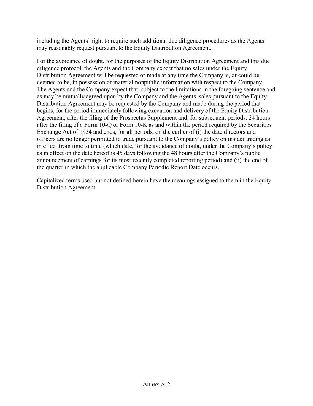 including the Agents’ right to require such additional due diligence procedures as the Agents may reasonably request pursuant to the Equity Distribution Agreement. For the avoidance of doubt, for the purposes of the Equity Distribution Agreement and this due diligence protocol, the Agents and the Company expect that no sales under the Equity Distribution Agreement will be requested or made at any time the Company is, or could be deemed to be, in possession of material nonpublic information with respect to the Company. The Agents and the Company expect that, subject to the limitations in the foregoing sentence and as may be mutually agreed upon by the Company and the Agents, sales pursuant to the Equity Distribution Agreement may be requested by the Company and made during the period that begins, for the period immediately following execution and delivery of the Equity Distribution Agreement, after the filing of the Prospectus Supplement and, for subsequent periods, 24 hours after the filing of a Form 10-Q or Form 10-K as and within the period required by the Securities Exchange Act of 1934 and ends, for all periods, on the earlier of (i) the date directors and officers are no longer permitted to trade pursuant to the Company’s policy on insider trading as in effect from time to time (which date, for the avoidance of doubt, under the Company’s policy as in effect on the date hereof is 45 days following the 48 hours after the Company’s public announcement of earnings for its most recently completed reporting period) and (ii) the end of the quarter in which the applicable Company Periodic Report Date occurs. Capitalized terms used but not defined herein have the meanings assigned to them in the Equity Distribution Agreement Annex A-2