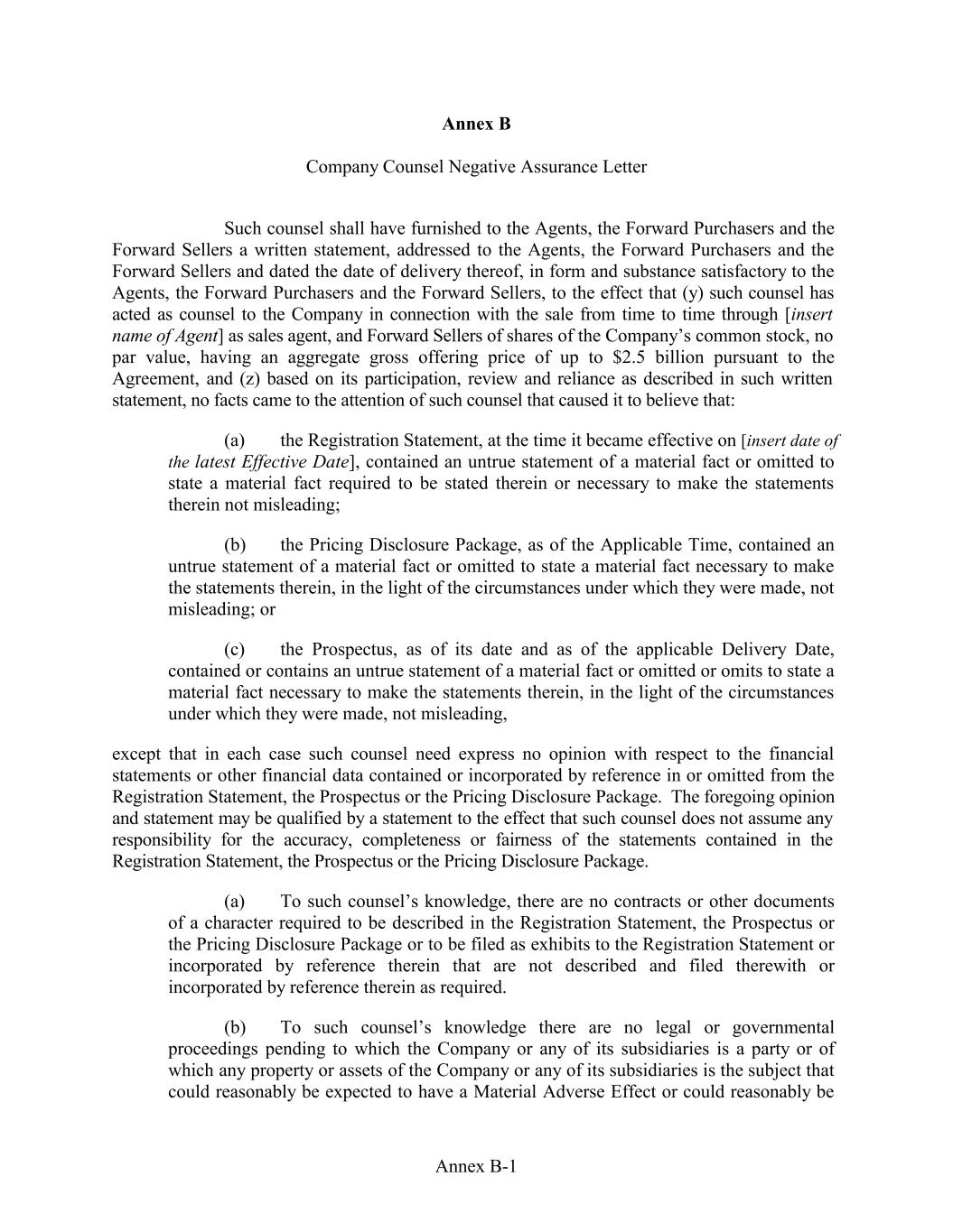 Annex B Company Counsel Negative Assurance Letter Such counsel shall have furnished to the Agents, the Forward Purchasers and the Forward Sellers a written statement, addressed to the Agents, the Forward Purchasers and the Forward Sellers and dated the date of delivery thereof, in form and substance satisfactory to the Agents, the Forward Purchasers and the Forward Sellers, to the effect that (y) such counsel has acted as counsel to the Company in connection with the sale from time to time through [insert name of Agent] as sales agent, and Forward Sellers of shares of the Company’s common stock, no par value, having an aggregate gross offering price of up to $2.5 billion pursuant to the Agreement, and (z) based on its participation, review and reliance as described in such written statement, no facts came to the attention of such counsel that caused it to believe that: (a) the Registration Statement, at the time it became effective on [insert date of the latest Effective Date], contained an untrue statement of a material fact or omitted to state a material fact required to be stated therein or necessary to make the statements therein not misleading; (b) the Pricing Disclosure Package, as of the Applicable Time, contained an untrue statement of a material fact or omitted to state a material fact necessary to make the statements therein, in the light of the circumstances under which they were made, not misleading; or (c) the Prospectus, as of its date and as of the applicable Delivery Date, contained or contains an untrue statement of a material fact or omitted or omits to state a material fact necessary to make the statements therein, in the light of the circumstances under which they were made, not misleading, except that in each case such counsel need express no opinion with respect to the financial statements or other financial data contained or incorporated by reference in or omitted from the Registration Statement, the Prospectus or the Pricing Disclosure Package. The foregoing opinion and statement may be qualified by a statement to the effect that such counsel does not assume any responsibility for the accuracy, completeness or fairness of the statements contained in the Registration Statement, the Prospectus or the Pricing Disclosure Package. (a) To such counsel’s knowledge, there are no contracts or other documents of a character required to be described in the Registration Statement, the Prospectus or the Pricing Disclosure Package or to be filed as exhibits to the Registration Statement or incorporated by reference therein that are not described and filed therewith or incorporated by reference therein as required. (b) To such counsel’s knowledge there are no legal or governmental proceedings pending to which the Company or any of its subsidiaries is a party or of which any property or assets of the Company or any of its subsidiaries is the subject that could reasonably be expected to have a Material Adverse Effect or could reasonably be Annex B-1