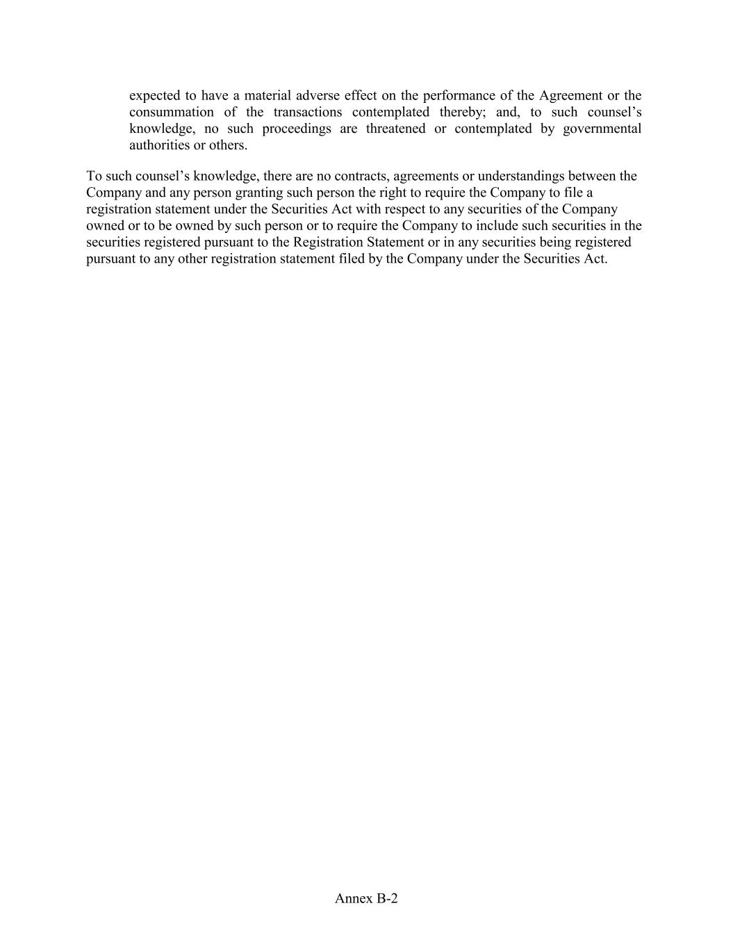 expected to have a material adverse effect on the performance of the Agreement or the consummation of the transactions contemplated thereby; and, to such counsel’s knowledge, no such proceedings are threatened or contemplated by governmental authorities or others. To such counsel’s knowledge, there are no contracts, agreements or understandings between the Company and any person granting such person the right to require the Company to file a registration statement under the Securities Act with respect to any securities of the Company owned or to be owned by such person or to require the Company to include such securities in the securities registered pursuant to the Registration Statement or in any securities being registered pursuant to any other registration statement filed by the Company under the Securities Act. Annex B-2