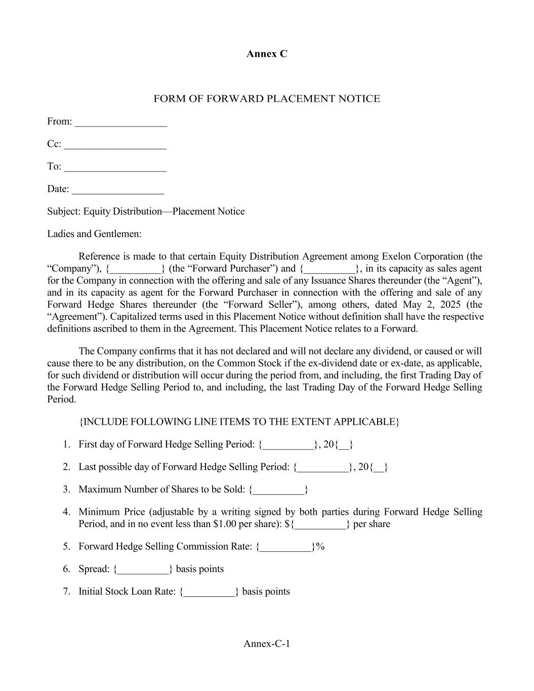Annex C FORM OF FORWARD PLACEMENT NOTICE From: __________________ Cc: ____________________ To: ____________________ Date: __________________ Subject: Equity Distribution—Placement Notice Ladies and Gentlemen: Reference is made to that certain Equity Distribution Agreement among Exelon Corporation (the “Company”), {__________} (the “Forward Purchaser”) and {__________}, in its capacity as sales agent for the Company in connection with the offering and sale of any Issuance Shares thereunder (the “Agent”), and in its capacity as agent for the Forward Purchaser in connection with the offering and sale of any Forward Hedge Shares thereunder (the “Forward Seller”), among others, dated May 2, 2025 (the “Agreement”). Capitalized terms used in this Placement Notice without definition shall have the respective definitions ascribed to them in the Agreement. This Placement Notice relates to a Forward. The Company confirms that it has not declared and will not declare any dividend, or caused or will cause there to be any distribution, on the Common Stock if the ex-dividend date or ex-date, as applicable, for such dividend or distribution will occur during the period from, and including, the first Trading Day of the Forward Hedge Selling Period to, and including, the last Trading Day of the Forward Hedge Selling Period. {INCLUDE FOLLOWING LINE ITEMS TO THE EXTENT APPLICABLE} 1. First day of Forward Hedge Selling Period: {__________}, 20{__} 2. Last possible day of Forward Hedge Selling Period: {__________}, 20{__} 3. Maximum Number of Shares to be Sold: {__________} 4. Minimum Price (adjustable by a writing signed by both parties during Forward Hedge Selling Period, and in no event less than $1.00 per share): ${__________} per share 5. Forward Hedge Selling Commission Rate: {__________}% 6. Spread: {__________} basis points 7. Initial Stock Loan Rate: {__________} basis points Annex-C-1