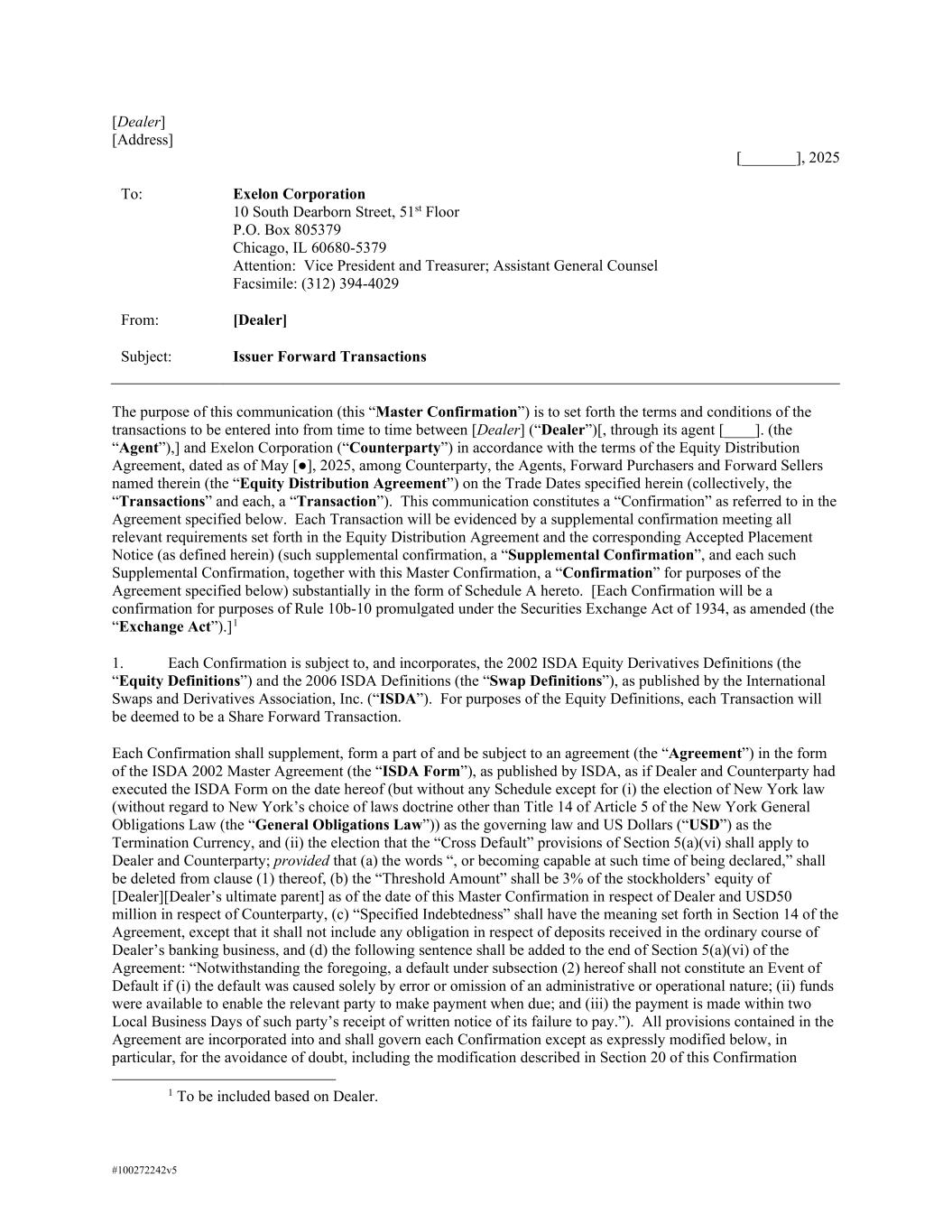 #100272242v5 [Dealer] [Address] [_______], 2025 To: Exelon Corporation 10 South Dearborn Street, 51st Floor P.O. Box 805379 Chicago, IL 60680-5379 Attention: Vice President and Treasurer; Assistant General Counsel Facsimile: (312) 394-4029 From: [Dealer] Subject: Issuer Forward Transactions The purpose of this communication (this “Master Confirmation”) is to set forth the terms and conditions of the transactions to be entered into from time to time between [Dealer] (“Dealer”)[, through its agent [____]. (the “Agent”),] and Exelon Corporation (“Counterparty”) in accordance with the terms of the Equity Distribution Agreement, dated as of May [●], 2025, among Counterparty, the Agents, Forward Purchasers and Forward Sellers named therein (the “Equity Distribution Agreement”) on the Trade Dates specified herein (collectively, the “Transactions” and each, a “Transaction”). This communication constitutes a “Confirmation” as referred to in the Agreement specified below. Each Transaction will be evidenced by a supplemental confirmation meeting all relevant requirements set forth in the Equity Distribution Agreement and the corresponding Accepted Placement Notice (as defined herein) (such supplemental confirmation, a “Supplemental Confirmation”, and each such Supplemental Confirmation, together with this Master Confirmation, a “Confirmation” for purposes of the Agreement specified below) substantially in the form of Schedule A hereto. [Each Confirmation will be a confirmation for purposes of Rule 10b-10 promulgated under the Securities Exchange Act of 1934, as amended (the “Exchange Act”).]1 1. Each Confirmation is subject to, and incorporates, the 2002 ISDA Equity Derivatives Definitions (the “Equity Definitions”) and the 2006 ISDA Definitions (the “Swap Definitions”), as published by the International Swaps and Derivatives Association, Inc. (“ISDA”). For purposes of the Equity Definitions, each Transaction will be deemed to be a Share Forward Transaction. Each Confirmation shall supplement, form a part of and be subject to an agreement (the “Agreement”) in the form of the ISDA 2002 Master Agreement (the “ISDA Form”), as published by ISDA, as if Dealer and Counterparty had executed the ISDA Form on the date hereof (but without any Schedule except for (i) the election of New York law (without regard to New York’s choice of laws doctrine other than Title 14 of Article 5 of the New York General Obligations Law (the “General Obligations Law”)) as the governing law and US Dollars (“USD”) as the Termination Currency, and (ii) the election that the “Cross Default” provisions of Section 5(a)(vi) shall apply to Dealer and Counterparty; provided that (a) the words “, or becoming capable at such time of being declared,” shall be deleted from clause (1) thereof, (b) the “Threshold Amount” shall be 3% of the stockholders’ equity of [Dealer][Dealer’s ultimate parent] as of the date of this Master Confirmation in respect of Dealer and USD50 million in respect of Counterparty, (c) “Specified Indebtedness” shall have the meaning set forth in Section 14 of the Agreement, except that it shall not include any obligation in respect of deposits received in the ordinary course of Dealer’s banking business, and (d) the following sentence shall be added to the end of Section 5(a)(vi) of the Agreement: “Notwithstanding the foregoing, a default under subsection (2) hereof shall not constitute an Event of Default if (i) the default was caused solely by error or omission of an administrative or operational nature; (ii) funds were available to enable the relevant party to make payment when due; and (iii) the payment is made within two Local Business Days of such party’s receipt of written notice of its failure to pay.”). All provisions contained in the Agreement are incorporated into and shall govern each Confirmation except as expressly modified below, in particular, for the avoidance of doubt, including the modification described in Section 20 of this Confirmation 1 To be included based on Dealer.
