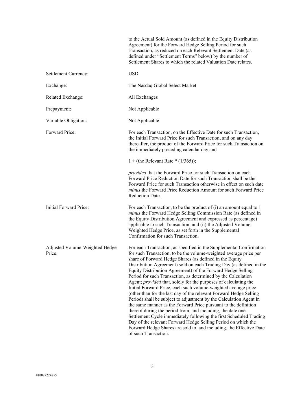 3 #100272242v5 to the Actual Sold Amount (as defined in the Equity Distribution Agreement) for the Forward Hedge Selling Period for such Transaction, as reduced on each Relevant Settlement Date (as defined under “Settlement Terms” below) by the number of Settlement Shares to which the related Valuation Date relates. Settlement Currency: USD Exchange: The Nasdaq Global Select Market Related Exchange: All Exchanges Prepayment: Not Applicable Variable Obligation: Not Applicable Forward Price: For each Transaction, on the Effective Date for such Transaction, the Initial Forward Price for such Transaction, and on any day thereafter, the product of the Forward Price for such Transaction on the immediately preceding calendar day and 1 + (the Relevant Rate * (1/365)); provided that the Forward Price for such Transaction on each Forward Price Reduction Date for such Transaction shall be the Forward Price for such Transaction otherwise in effect on such date minus the Forward Price Reduction Amount for such Forward Price Reduction Date. Initial Forward Price: For each Transaction, to be the product of (i) an amount equal to 1 minus the Forward Hedge Selling Commission Rate (as defined in the Equity Distribution Agreement and expressed as percentage) applicable to such Transaction; and (ii) the Adjusted Volume- Weighted Hedge Price, as set forth in the Supplemental Confirmation for such Transaction. Adjusted Volume-Weighted Hedge Price: For each Transaction, as specified in the Supplemental Confirmation for such Transaction, to be the volume-weighted average price per share of Forward Hedge Shares (as defined in the Equity Distribution Agreement) sold on each Trading Day (as defined in the Equity Distribution Agreement) of the Forward Hedge Selling Period for such Transaction, as determined by the Calculation Agent; provided that, solely for the purposes of calculating the Initial Forward Price, each such volume-weighted average price (other than for the last day of the relevant Forward Hedge Selling Period) shall be subject to adjustment by the Calculation Agent in the same manner as the Forward Price pursuant to the definition thereof during the period from, and including, the date one Settlement Cycle immediately following the first Scheduled Trading Day of the relevant Forward Hedge Selling Period on which the Forward Hedge Shares are sold to, and including, the Effective Date of such Transaction.