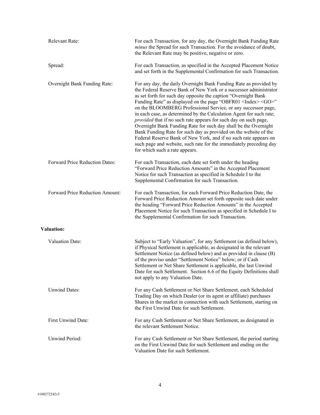 4 #100272242v5 Relevant Rate: For each Transaction, for any day, the Overnight Bank Funding Rate minus the Spread for such Transaction. For the avoidance of doubt, the Relevant Rate may be positive, negative or zero. Spread: For each Transaction, as specified in the Accepted Placement Notice and set forth in the Supplemental Confirmation for such Transaction. Overnight Bank Funding Rate: For any day, the daily Overnight Bank Funding Rate as provided by the Federal Reserve Bank of New York or a successor administrator as set forth for such day opposite the caption “Overnight Bank Funding Rate” as displayed on the page “OBFR01 <Index> <GO>” on the BLOOMBERG Professional Service, or any successor page, in each case, as determined by the Calculation Agent for such rate; provided that if no such rate appears for such day on such page, Overnight Bank Funding Rate for such day shall be the Overnight Bank Funding Rate for such day as provided on the website of the Federal Reserve Bank of New York, and if no such rate appears on such page and website, such rate for the immediately preceding day for which such a rate appears. Forward Price Reduction Dates: For each Transaction, each date set forth under the heading “Forward Price Reduction Amounts” in the Accepted Placement Notice for such Transaction as specified in Schedule I to the Supplemental Confirmation for such Transaction. Forward Price Reduction Amount: For each Transaction, for each Forward Price Reduction Date, the Forward Price Reduction Amount set forth opposite such date under the heading “Forward Price Reduction Amounts” in the Accepted Placement Notice for such Transaction as specified in Schedule I to the Supplemental Confirmation for such Transaction. Valuation: Valuation Date: Subject to “Early Valuation”, for any Settlement (as defined below), if Physical Settlement is applicable, as designated in the relevant Settlement Notice (as defined below) and as provided in clause (B) of the proviso under “Settlement Notice” below; or if Cash Settlement or Net Share Settlement is applicable, the last Unwind Date for such Settlement. Section 6.6 of the Equity Definitions shall not apply to any Valuation Date. Unwind Dates: For any Cash Settlement or Net Share Settlement, each Scheduled Trading Day on which Dealer (or its agent or affiliate) purchases Shares in the market in connection with such Settlement, starting on the First Unwind Date for such Settlement. First Unwind Date: For any Cash Settlement or Net Share Settlement, as designated in the relevant Settlement Notice. Unwind Period: For any Cash Settlement or Net Share Settlement, the period starting on the First Unwind Date for such Settlement and ending on the Valuation Date for such Settlement.